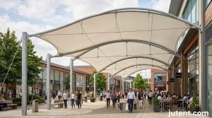 Tensile membrane structures handle the majority of modern retail walkway projects. These forms utilize double-curvature—such as hypar (hyperbolic paraboloid), conic, or barrel vault designs—to achieve structural stability. The tension applied to the membrane transfers wind and snow loads efficiently to the primary steelwork, allowing for greater distances between support columns. A well-engineered retail tensile canopy can achieve clear spans of 10 to 15 meters between columns, minimizing ground-level obstructions for shoppers and maximizing retail storefront visibility.