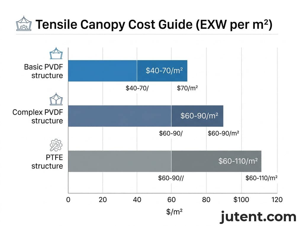 For a tensile membrane structure with minimal steel, such as a very simple, small-scale canopy, you can expect a range of $30–$50/m². This category usually applies to basic, functional designs where the membrane is the dominant structural element.