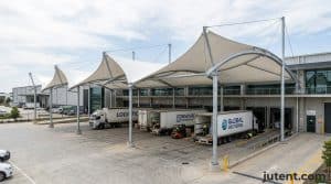 Consider a standard PVDF membrane, simple form loading dock canopy. Importing from China, the EXW (Ex Works) price might range from $40–$70/m² for a project scope of 100 m² or more. This price covers the design, engineering, fabrication, and quality control (ISO 9001, SGS certified) of the structure. To this, contractors must add shipping costs, import duties, and local transportation. Even with these additional expenses, the total landed cost often remains highly competitive.
