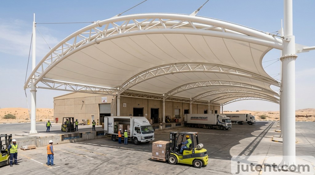 A warehouse tensile canopy in the Middle East must handle 45°C+ temperatures and intense UV. This guide covers what contractors in the UAE and Saudi Arabia need to specify.