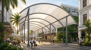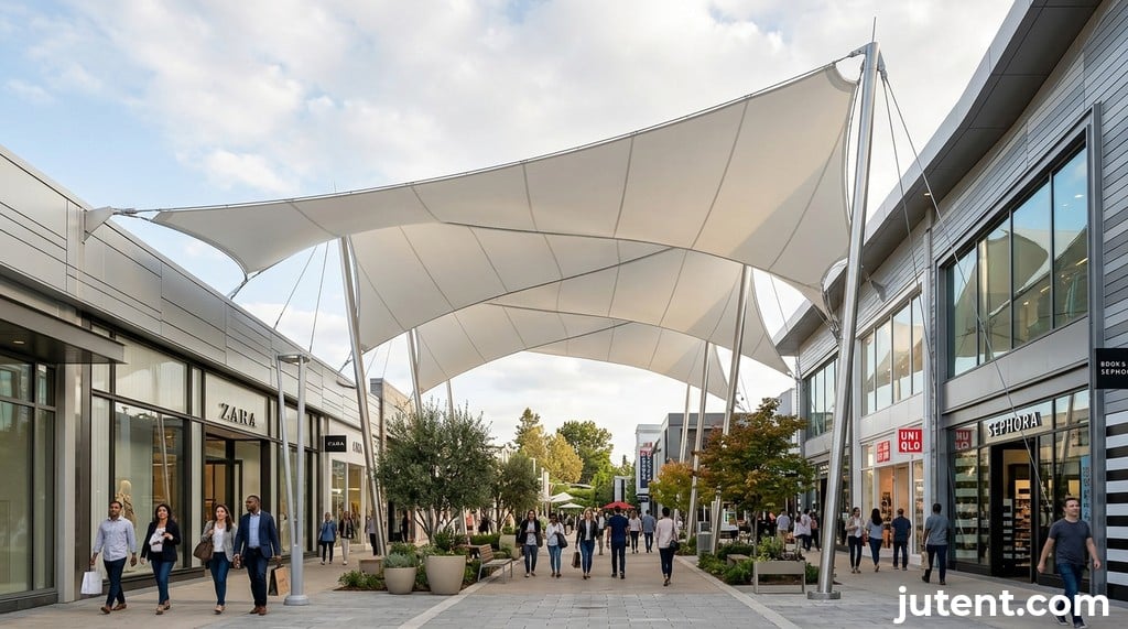The longevity and performance of a retail walkway canopy are directly tied to the quality of its materials. As a dedicated retail walkway canopy manufacturer, Jutent prioritizes the use of high-grade membranes and reliable steel to ensure durability and aesthetic appeal for decades. Our standard membrane offering is 1050 g/m² PVDF, known for its excellent UV resistance, self-cleaning properties, and a typical service life of 15+ years, backed by a 10-year warranty. For projects demanding even greater longevity and performance, we offer PTFE membrane, which boasts a 25+ year service life and a 15-year warranty.