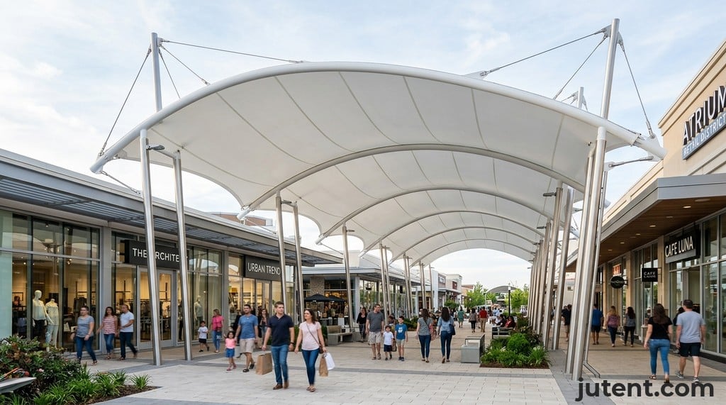 High-quality PVDF (10-year warranty, 15+ years service life) and PTFE (15-year warranty, 25+ years service life) membranes are engineered with specific coatings and material compositions to achieve excellent UPF ratings, typically blocking 90-98% of harmful UV rays. This protection comes from the material's inherent ability to reflect, absorb, and scatter UV radiation, not simply its visible light spectrum. White or light-coloured membranes are often preferred for school walkway canopies because they reflect more solar radiation, resulting in a cooler ambient temperature underneath the canopy. This cooling effect enhances comfort for students and staff. While colour can affect visible light transmission and the overall aesthetic, always prioritize the membrane's certified UPF rating for actual UV protection. Jutent's standard 1050 g/m² PVDF or PTFE membranes are selected for their high UPF values and durability.