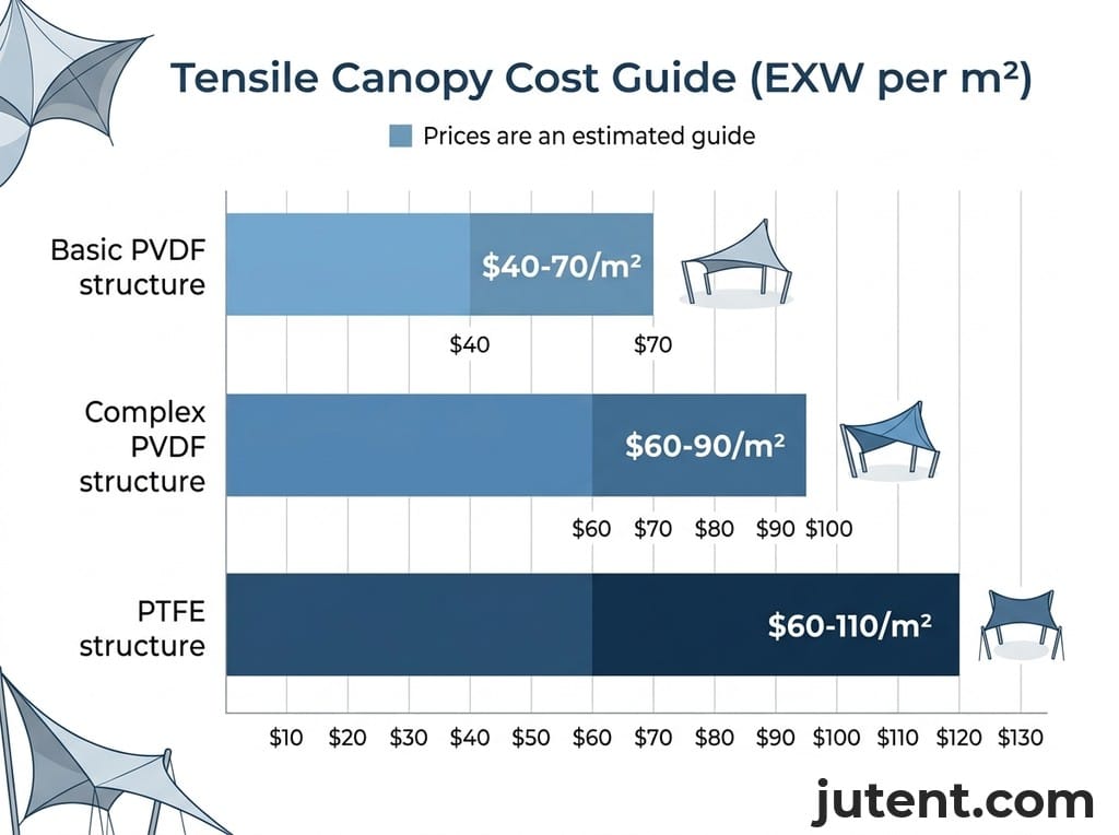 These figures are general guidelines. Actual costs are subject to project-specific design, engineering requirements, membrane type (1050 g/m² PVDF or PTFE are standard), steel grade (Q235B, Q355B), and the complexity of the fabrication and installation process. For export projects, Jutent can provide design drawings, calculations, material specifications, installation manuals, and free remote guidance, subject to project scope and contract terms. On-site supervision is also available as a paid service.