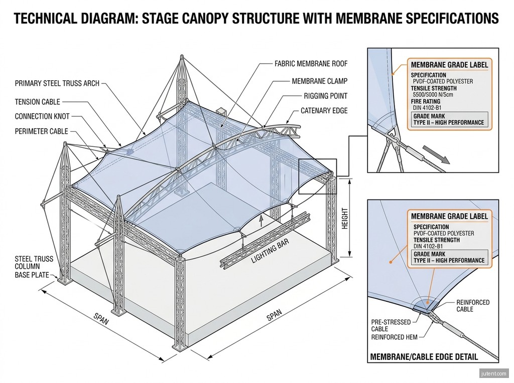PVDF and PTFE membranes both work for outdoor stage canopies, but they perform differently over time. This comparison covers UV resistance, fire rating, acoustic performance, and the cost difference that matters for a performance venue project.