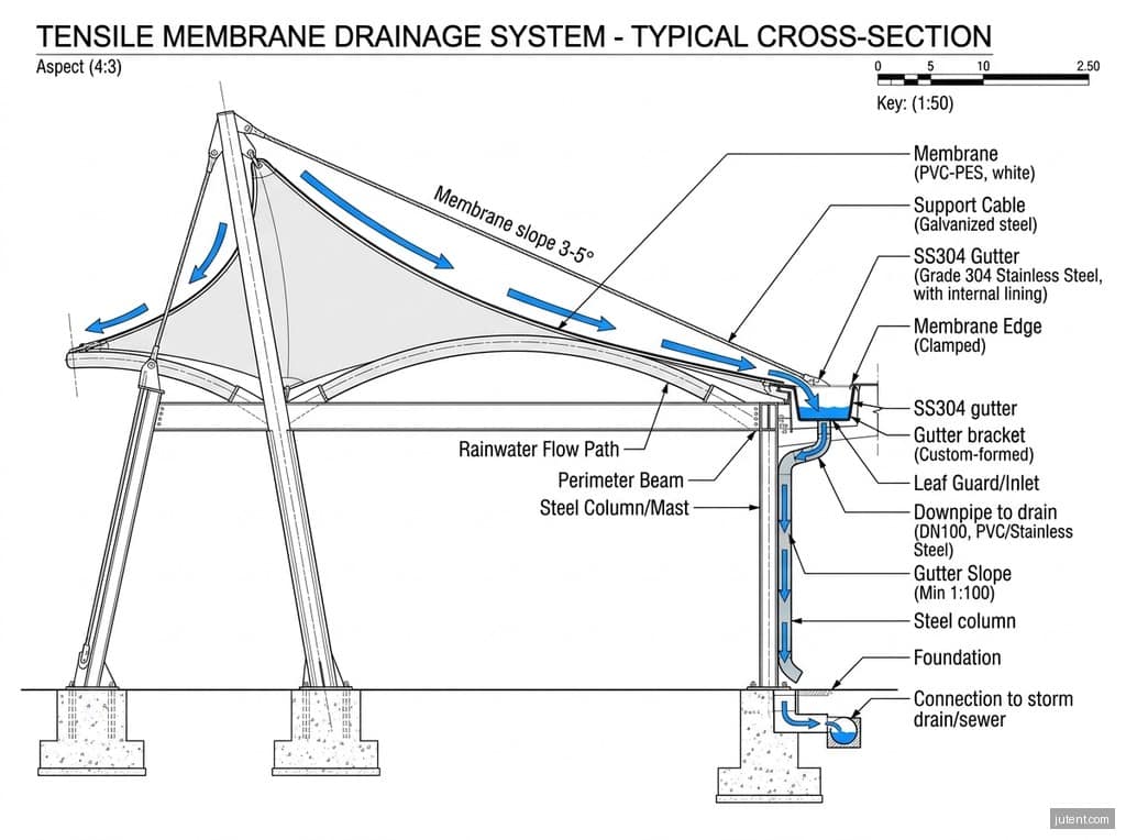 One notable project involved a multi-court shade structure for a private sports academy in Riyadh, Saudi Arabia. The client required a solution that would provide maximum UV protection and heat reduction for players, with a design life exceeding 20 years. We specified a high-grade PVDF membrane with enhanced UV stabilization and a reflective surface, supported by a hot-dip galvanized steel frame. The drainage system was custom-designed with oversized gutters and accessible clean-out points to manage sand accumulation effectively. The structure was engineered to SBC 301, with a design wind speed of 50 m/s, ensuring its resilience against local wind events.