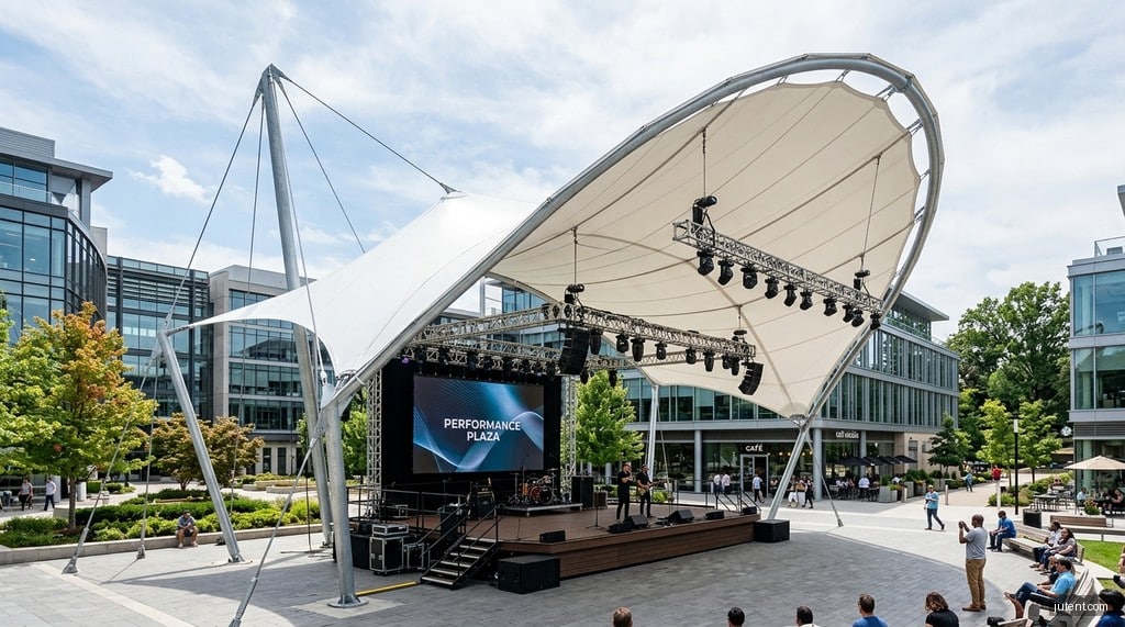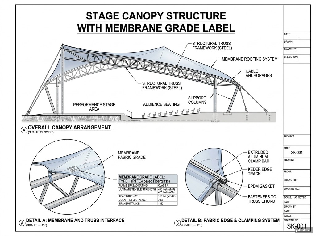 PVDF and PTFE membranes both work for outdoor stage canopies, but they perform differently over time. This comparison covers UV resistance, fire rating, acoustic performance, and the cost difference that matters for a performance venue project.