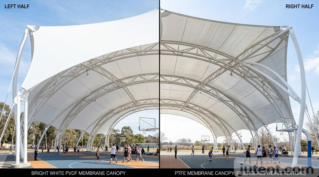 PVDF and PTFE membranes both work for sports court canopies, but they perform differently over time. This comparison covers UV resistance, fire rating, lifespan, and the cost difference that actually matters for a B2B project.
