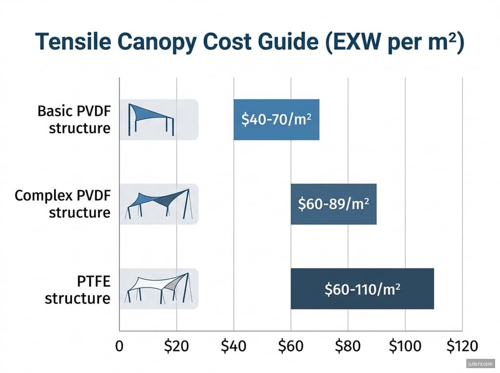 2. Membrane Material: The choice between PVDF and PTFE membrane significantly impacts the tensile canopy budget. PVDF (Polyvinylidene Fluoride) is a common, cost-effective choice with a 10-year warranty and 15+ years service life. PTFE (Polytetrafluoroethylene) offers superior durability, a 15-year warranty, and 25+ years service life, but adds approximately $20/m² to the PVDF range.