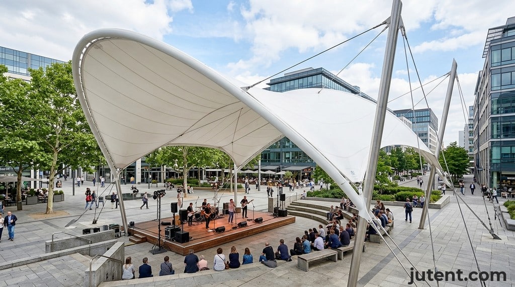 Wind resistance is a critical factor for any outdoor structure, especially those intended for permanent installation. Tensile stage canopies inherently excel in this area due to their aerodynamic forms and tensioned membrane design. The curved, often conical or hyperbolic paraboloid shapes of tensile structures allow wind to flow over and around them, reducing direct pressure points. The membrane itself is under constant tension, distributing loads efficiently throughout the entire structure, including the supporting columns and foundation. This design minimizes flapping and stress concentrations, making them highly resilient to strong winds. Based on Jutent's experience across 400+ projects in 30+ countries, properly engineered tensile structures can be designed to withstand hurricane-force winds, with specific wind load capacities calculated according to local building codes and site-specific conditions.