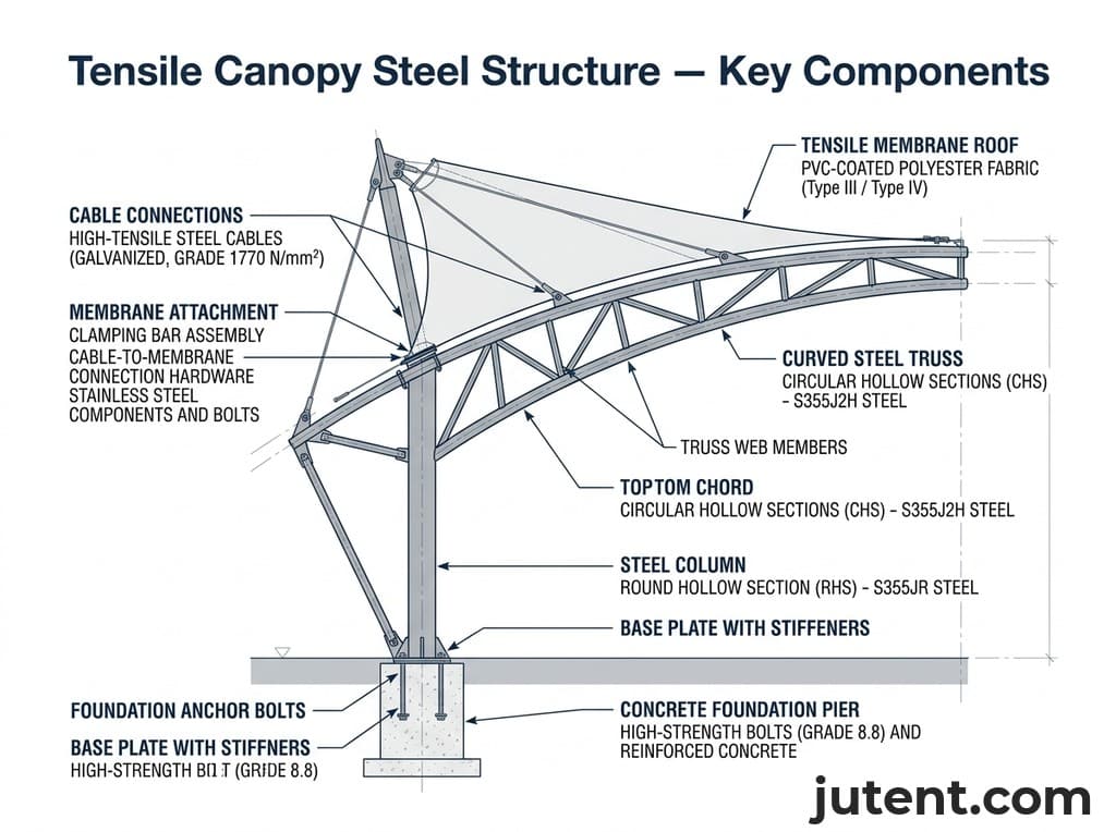 Tensile stage canopies are engineered with substantial rigging capacity as an integral part of their design. The reliable steel framework, high-strength cables, and heavy-duty connections are designed to bear significant suspended loads. Rigging points can be strategically integrated into the structural design, allowing for the safe attachment of hundreds or even thousands of kilograms of equipment. For example, a typical tensile stage canopy designed by Jutent can incorporate dedicated rigging trusses or attachment points capable of supporting distributed loads of 50-100 kg/m² or concentrated loads of several tonnes at specific points, subject to project design. The entire structure is analyzed to ensure that these loads are safely transferred through the membrane, cables, and columns to the foundations. This allows for complex and dynamic stage productions without compromising structural integrity.
