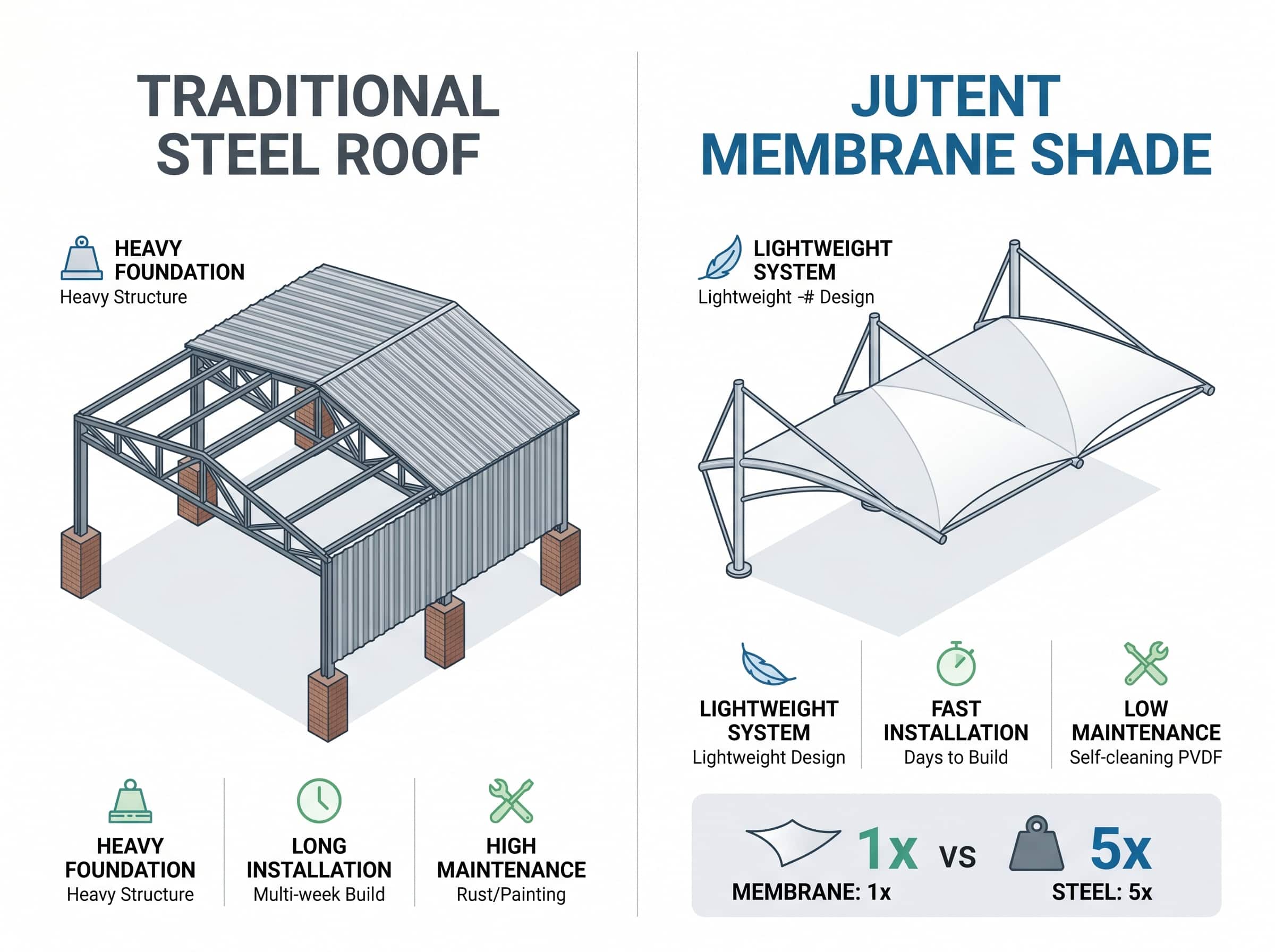 Stop overpaying for heavy steel and prolonged installation labor. A tensioned membrane structure delivers superior weather protection, modern aesthetics, and undeniable cost efficiency.