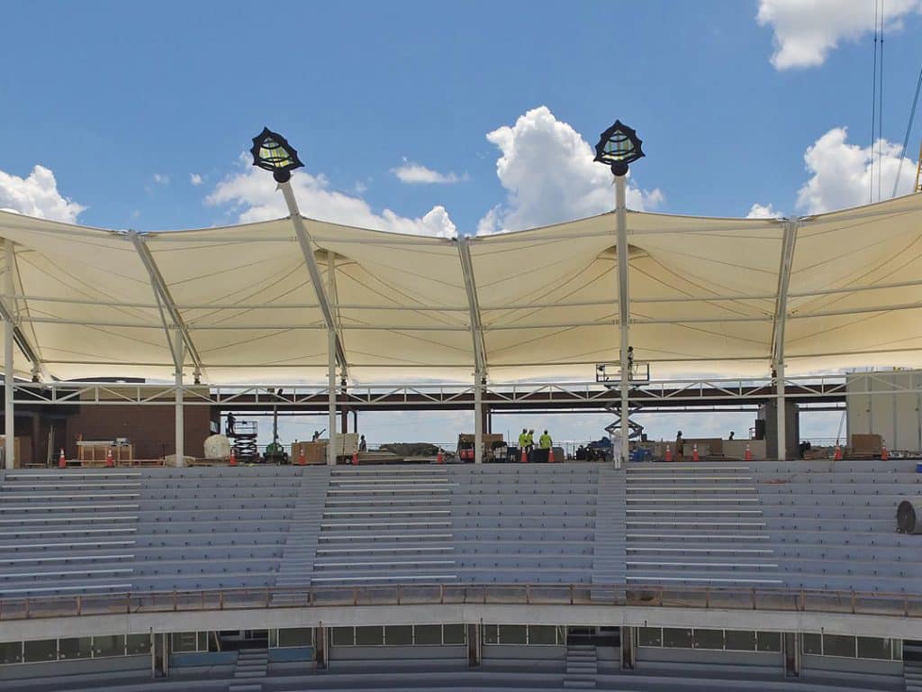 Because all welding and cutting are completed at our factory, a standard 4-man crew can typically bolt together the steel framework and tension the membrane of a 200-seat bleacher shade in 3 to 5 days, depending on weather conditions.