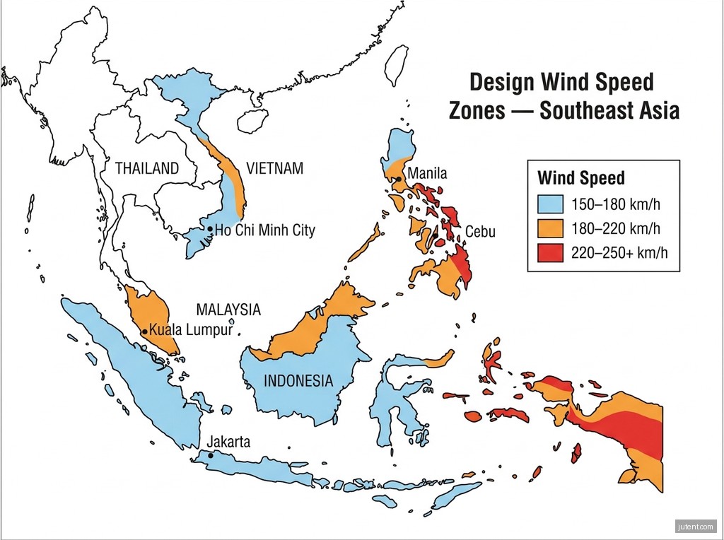 A: The National Structural Code of the Philippines (NSCP) requires design wind speeds of 200–250 km/h in most Philippine locations, depending on the specific site’s exposure category and elevation. This accounts for the frequent and intense typhoon activity in the archipelago. Jutent Engineering always designs to meet or exceed these stringent local code requirements, ensuring the safety and longevity of the structure even in extreme weather events.