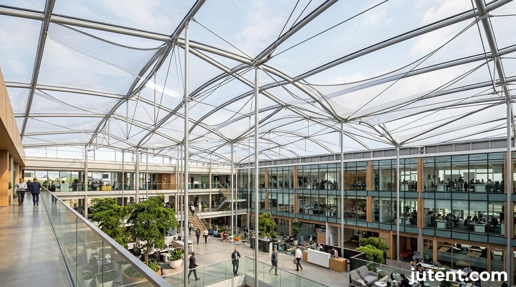 The longevity and performance of an atrium tensile skylight are directly tied to the quality of its materials. As a leading atrium tensile skylight supplier, Jutent specifies high-grade membranes and steel, ensuring durability and aesthetic appeal for decades. Our standard membrane is 1050 g/m² PVDF, offering a 10-year warranty and a service life of 15+ years. For projects requiring enhanced performance and longevity, PTFE membrane is available, providing a 15-year warranty and a service life of 25+ years. PTFE membrane typically adds approximately $20/m² to the PVDF range.