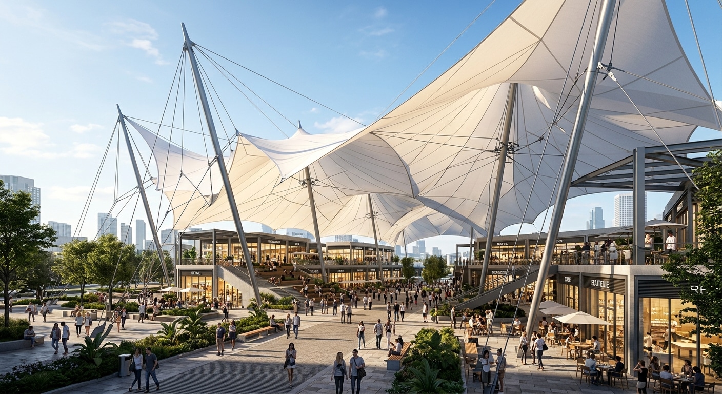 As a factory-direct manufacturer, Jutent Inc. delivers custom tensile membrane roof structures for commercial plazas and retail spaces, ensuring superior quality and significant cost savings for your project.