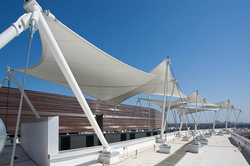 A rigid steel or aluminum skeleton defines the architectural form, while the membrane functions as a lightweight enclosure. The main structural loads are carried by the frame, with the membrane resisting wind and environmental forces.