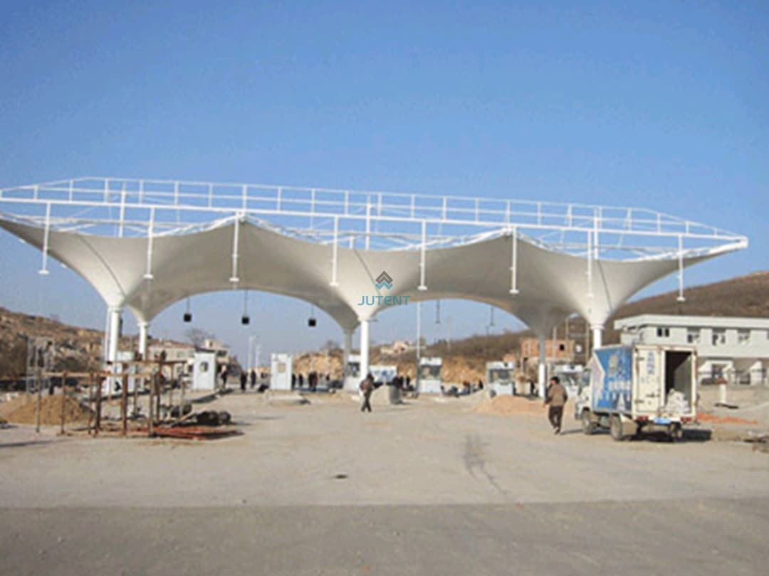 Highway toll stations require robust architectural solutions that ensure continuous operations while protecting staff and equipment from extreme weather conditions. The umbrella-shaped tensile membrane structure provides a cost-effective, high-clearance roofing system tailored for high-traffic infrastructure environments.