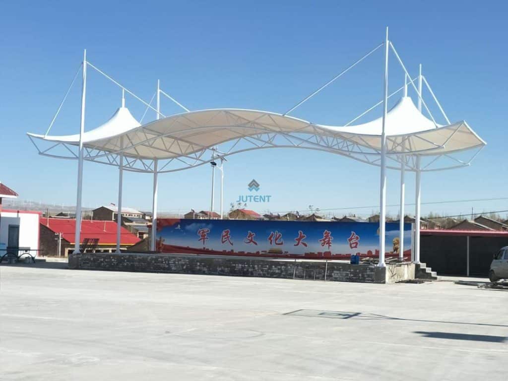 This arched triangular truss structure in Vietnam provides 186㎡ of reliable event coverage. Engineered to withstand 180 km/h winds, the PVDF stage canopy system delivers durable long-span protection for outdoor performances.
