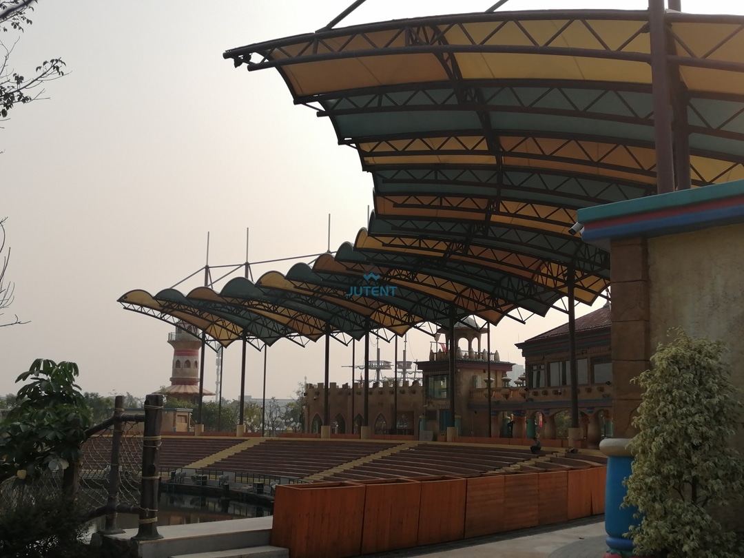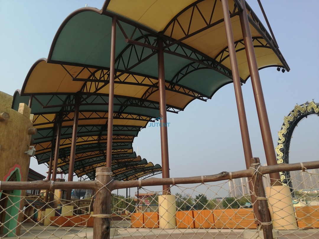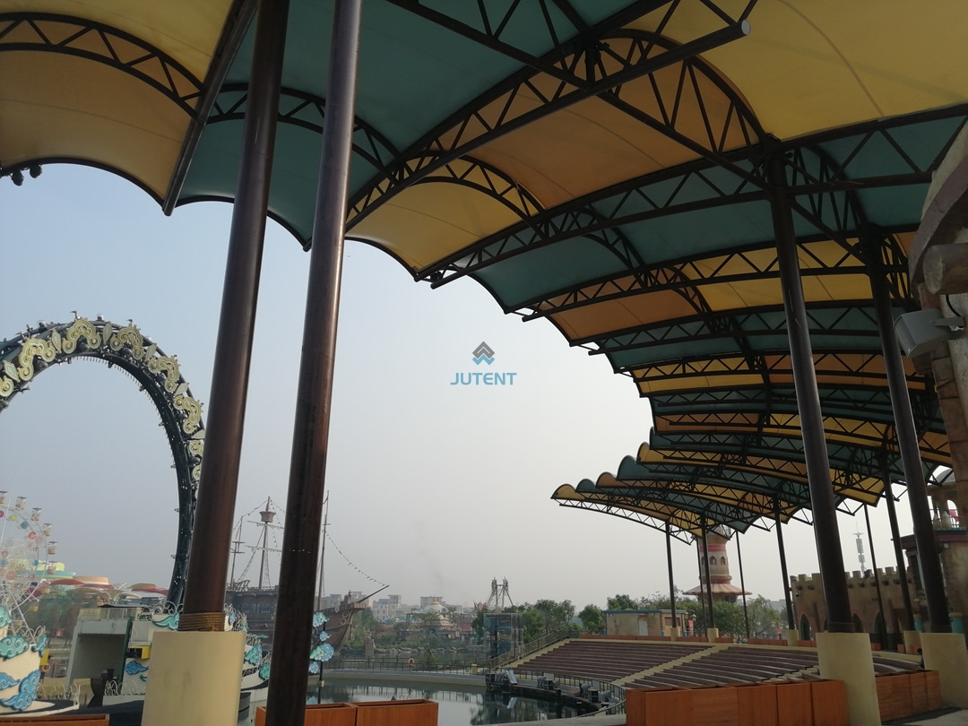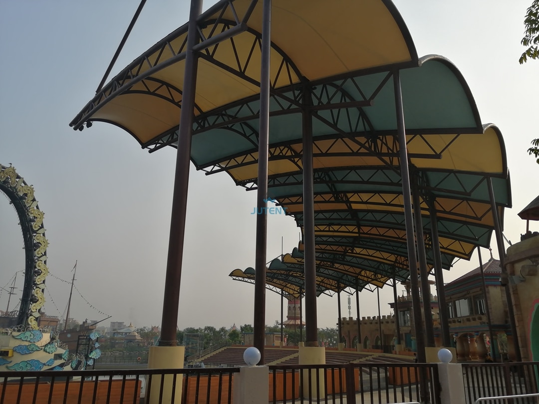 Durable steel frame with weather-resistant membrane, offering sun and rain protection for amusement park stands with customizable design.