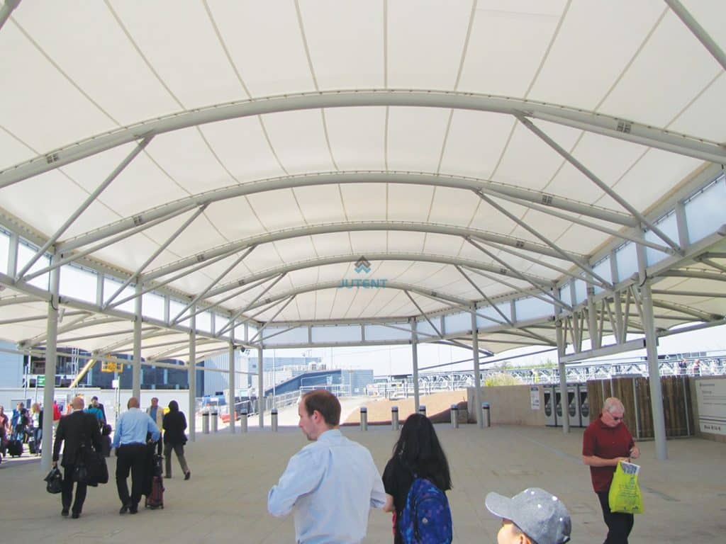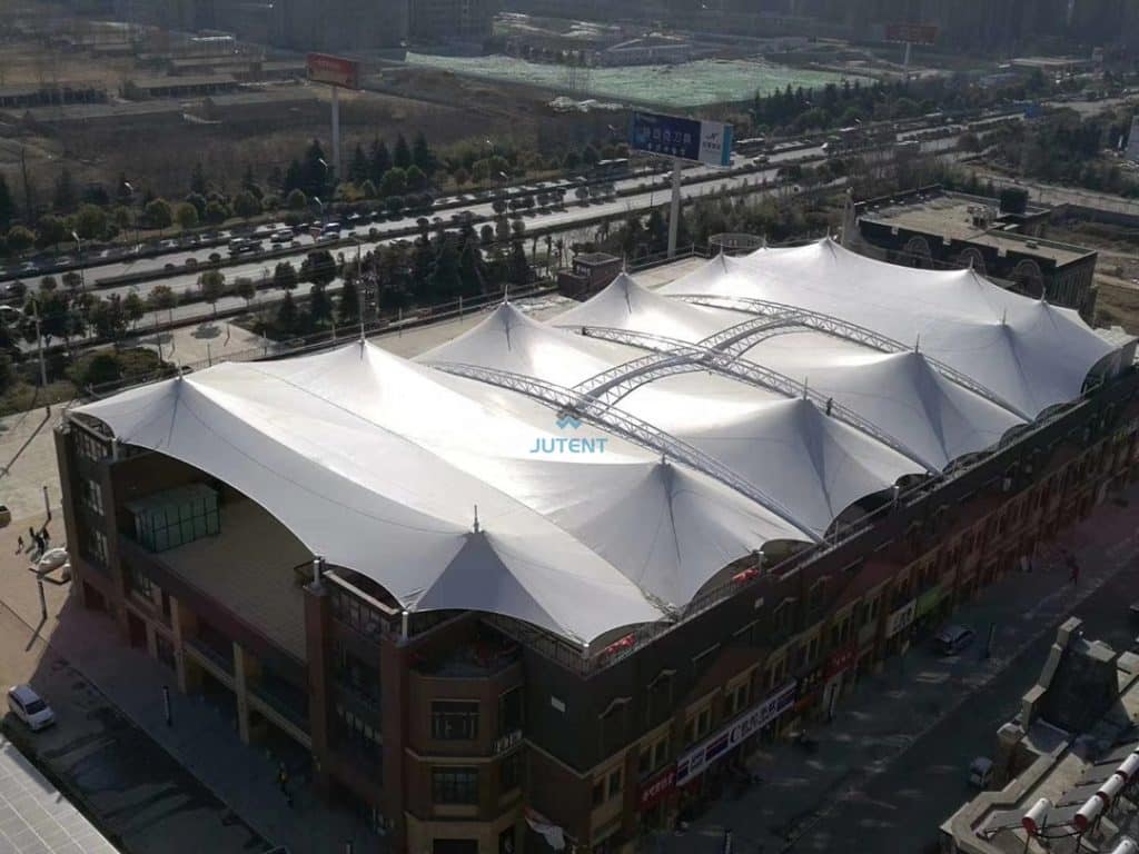 This custom PVDF architectural landmark in Nigeria features a 480㎡ footprint and integrated concealed drainage. The durable Restaurant Canopy Design provides a fire-rated membrane solution for upscale outdoor dining venues.