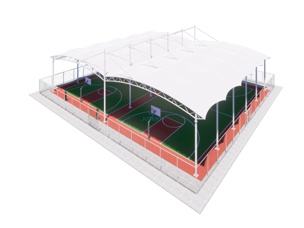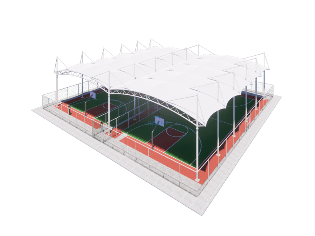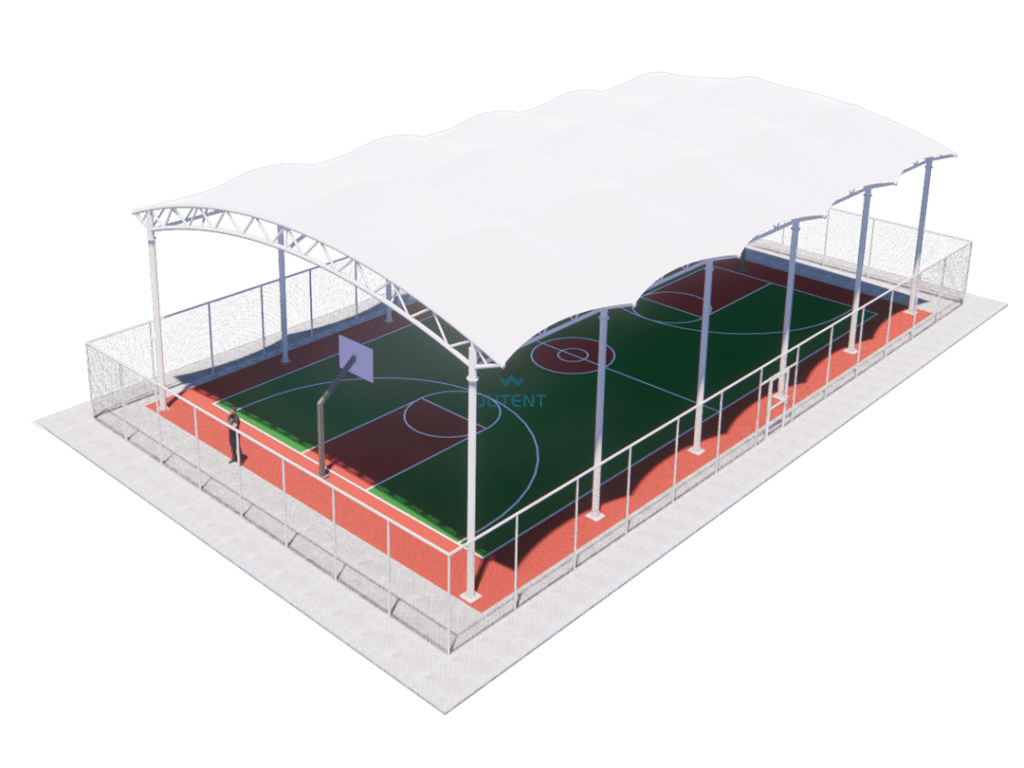 Curved tensile membrane canopy for tennis courts, providing durable sun and rain protection, excellent ventilation, and efficient, cost-effective installation.