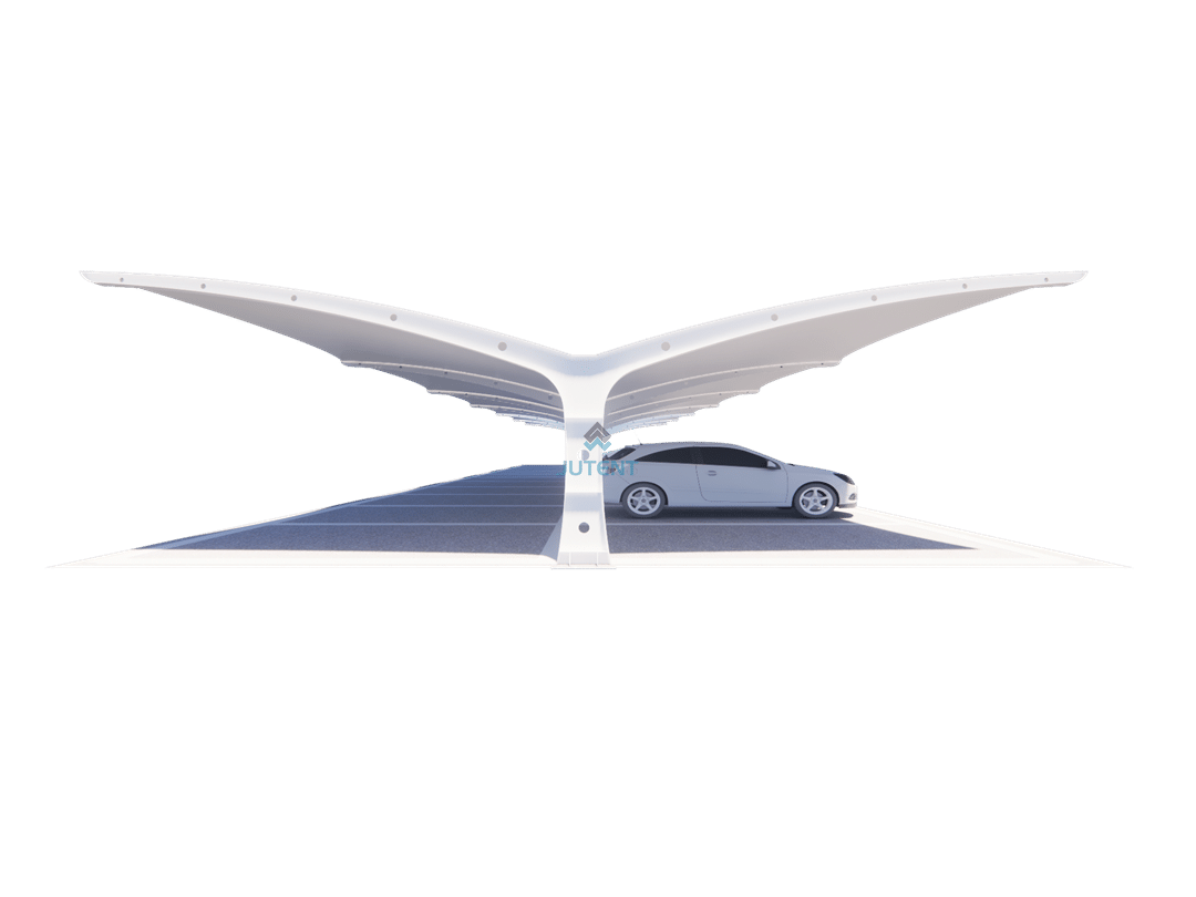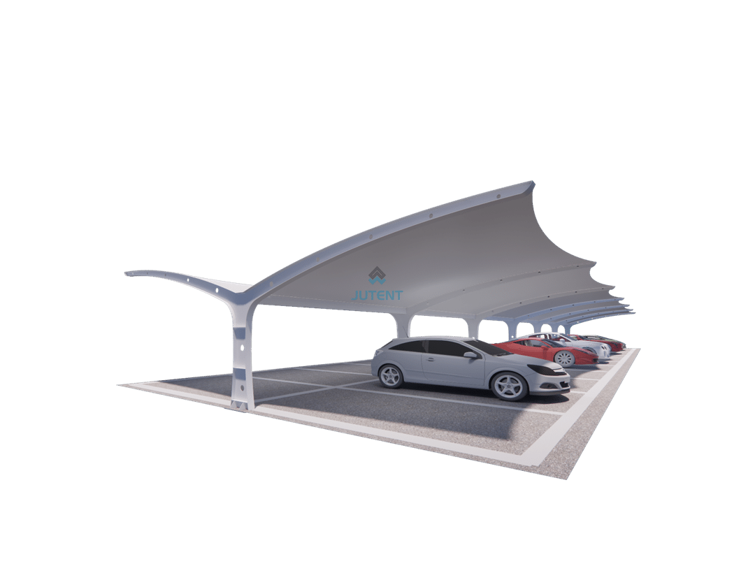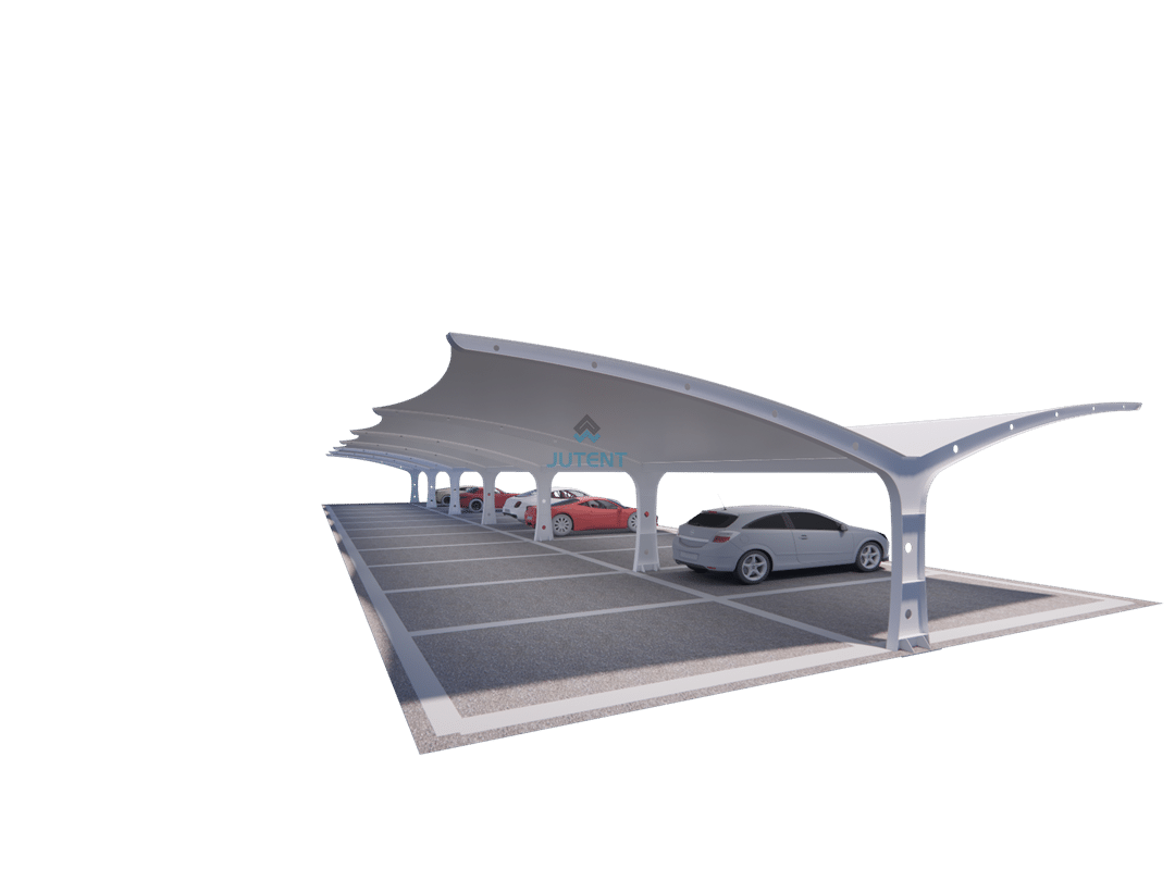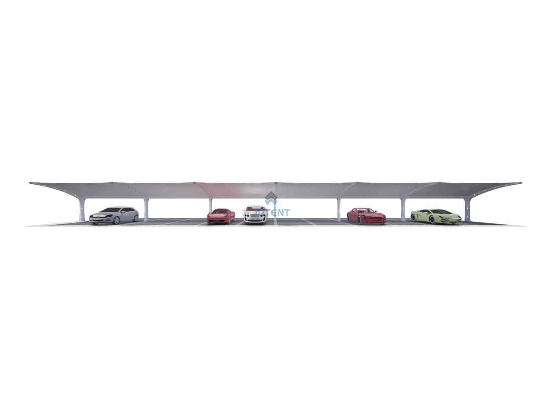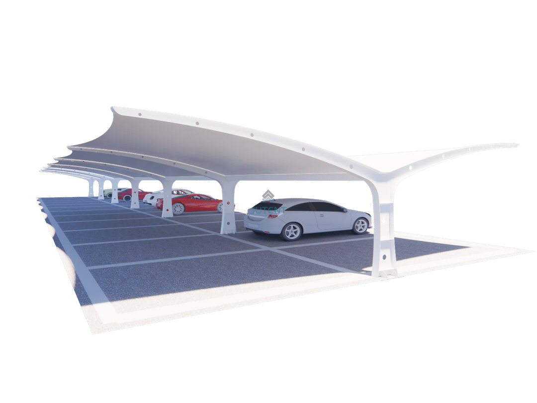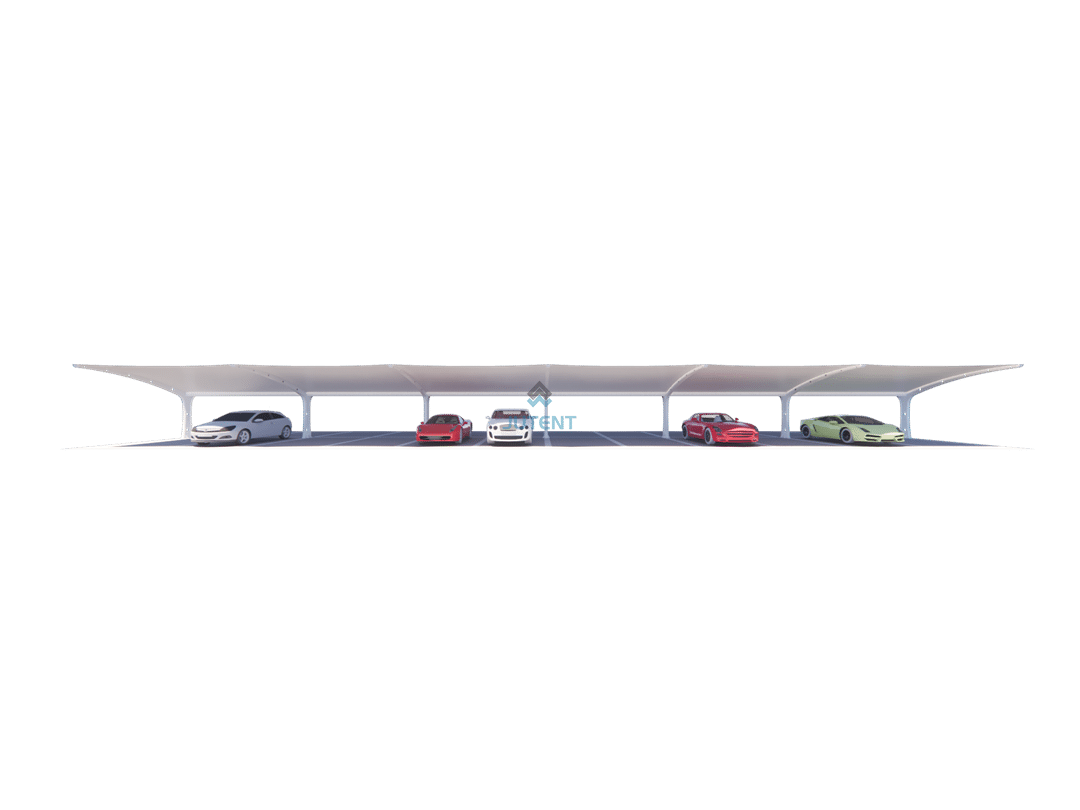 Double-sided I-beam tensile membrane carport featuring a stable steel structure and efficient coverage, ideal for commercial, residential, and industrial parking areas