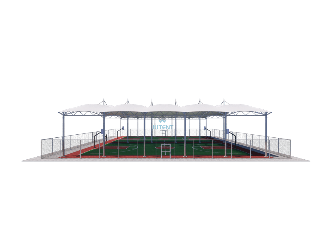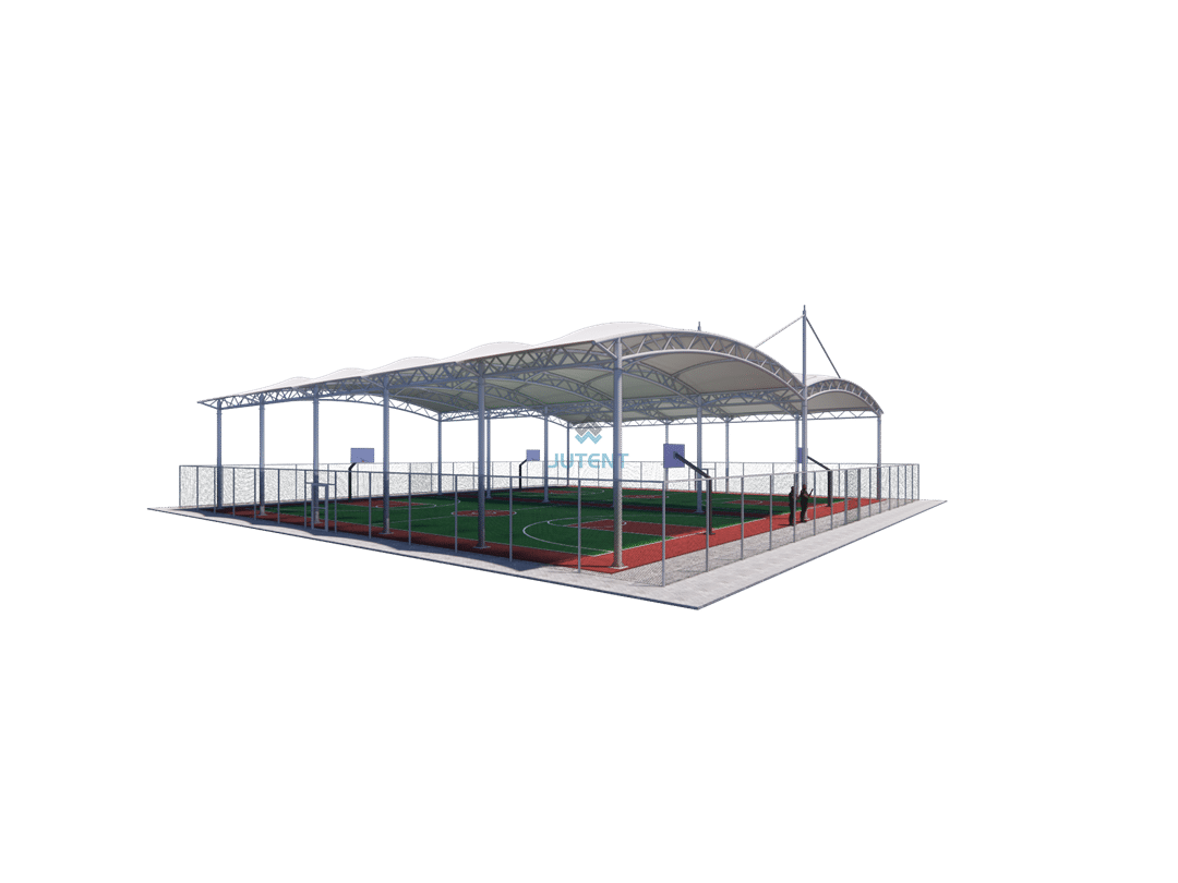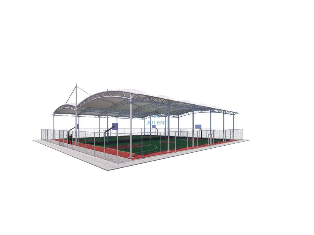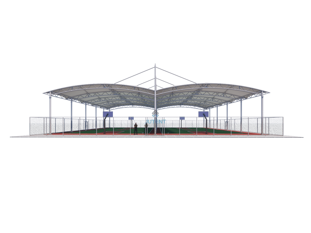 Double-court basketball canopy, 40m × 40m × 8m standard size, customizable. Durable tensile membrane for large sports facilities, offering reliable sun and rain protection.