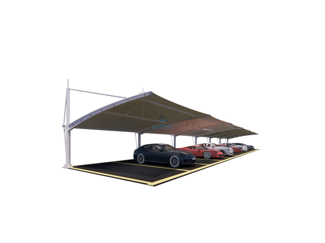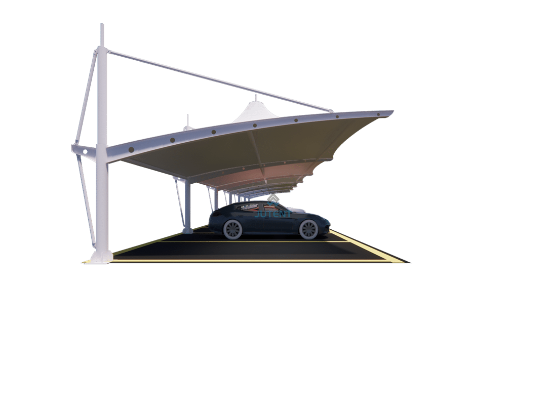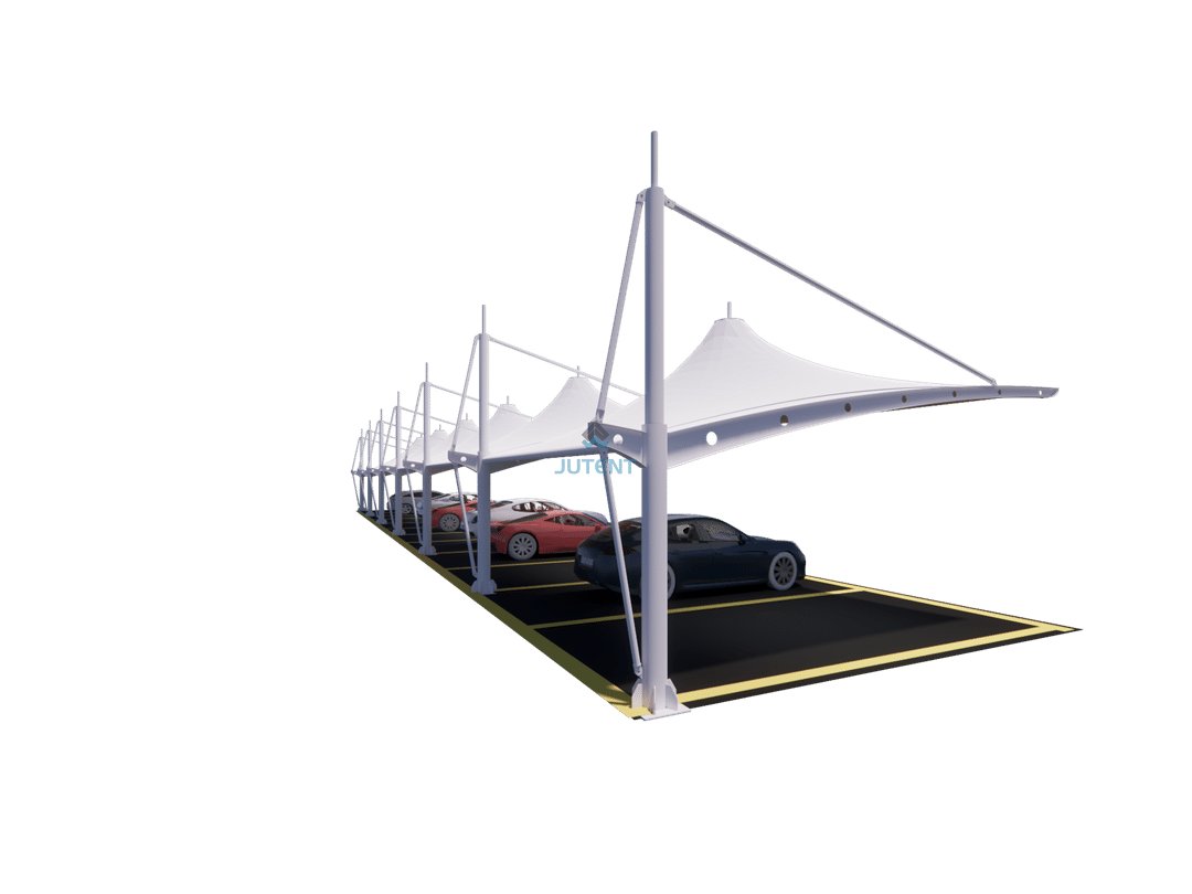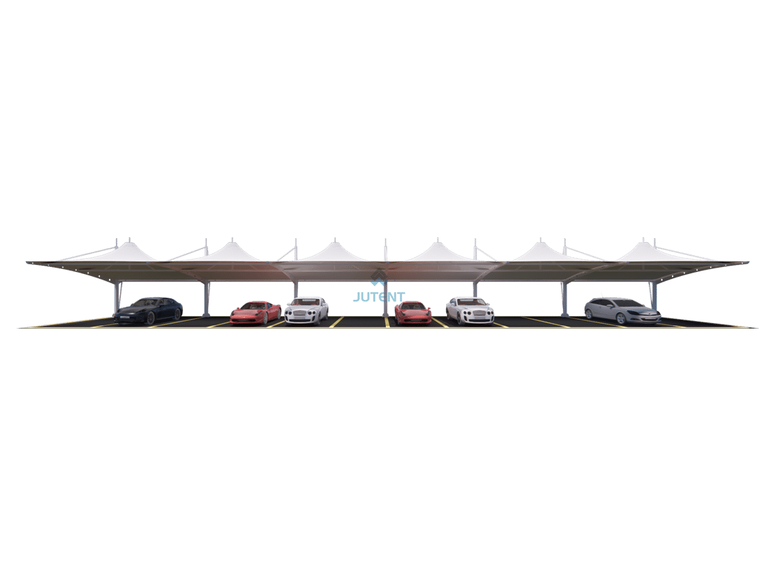 Rod-supported dome-top tensile membrane carport with stable steel frame and efficient coverage, ideal for commercial, residential, and industrial parking areas.