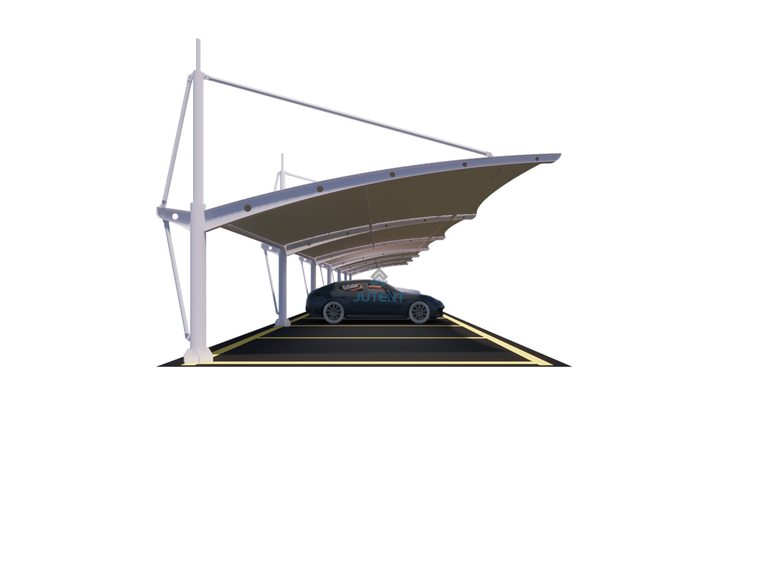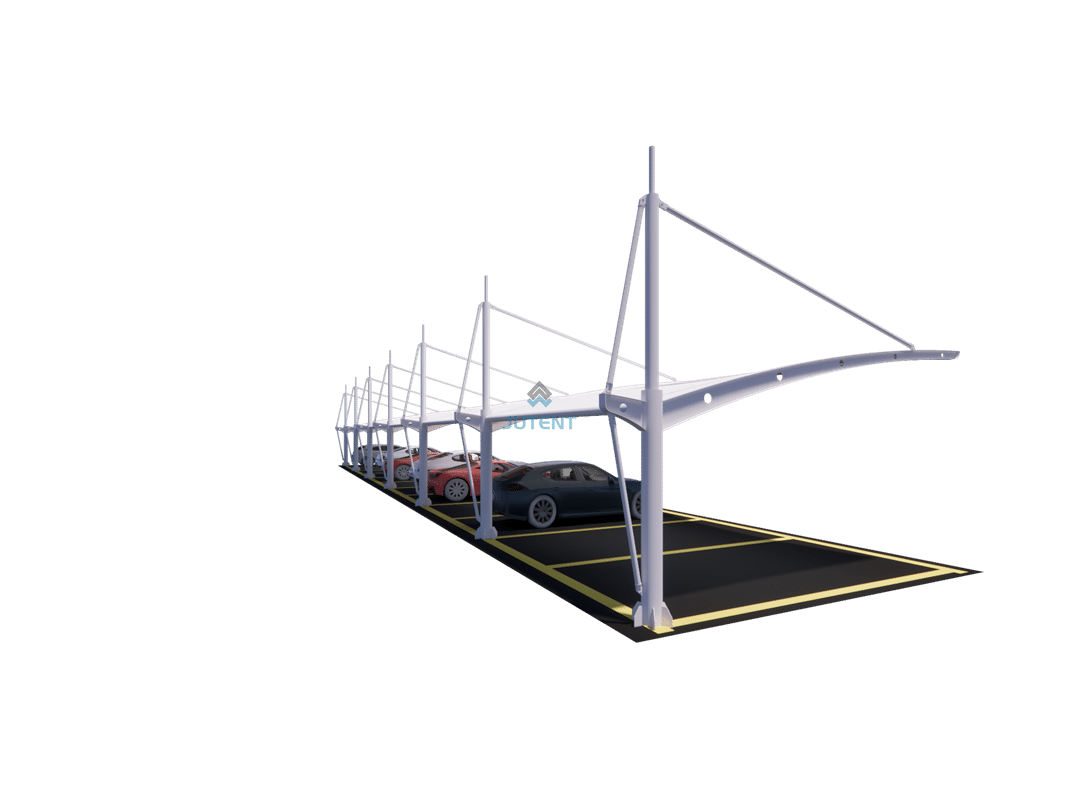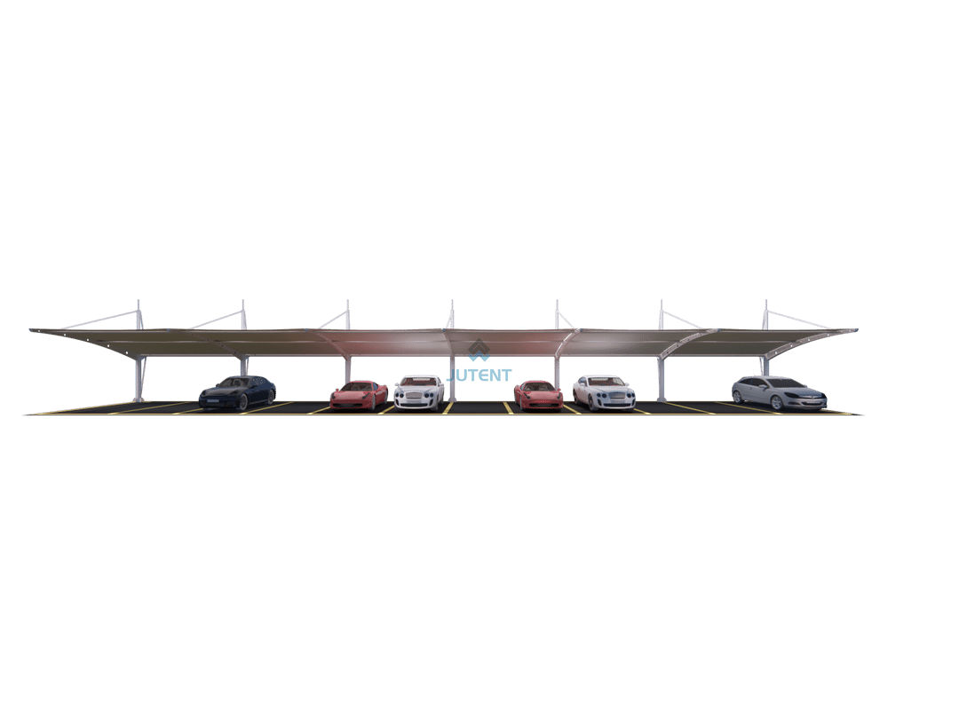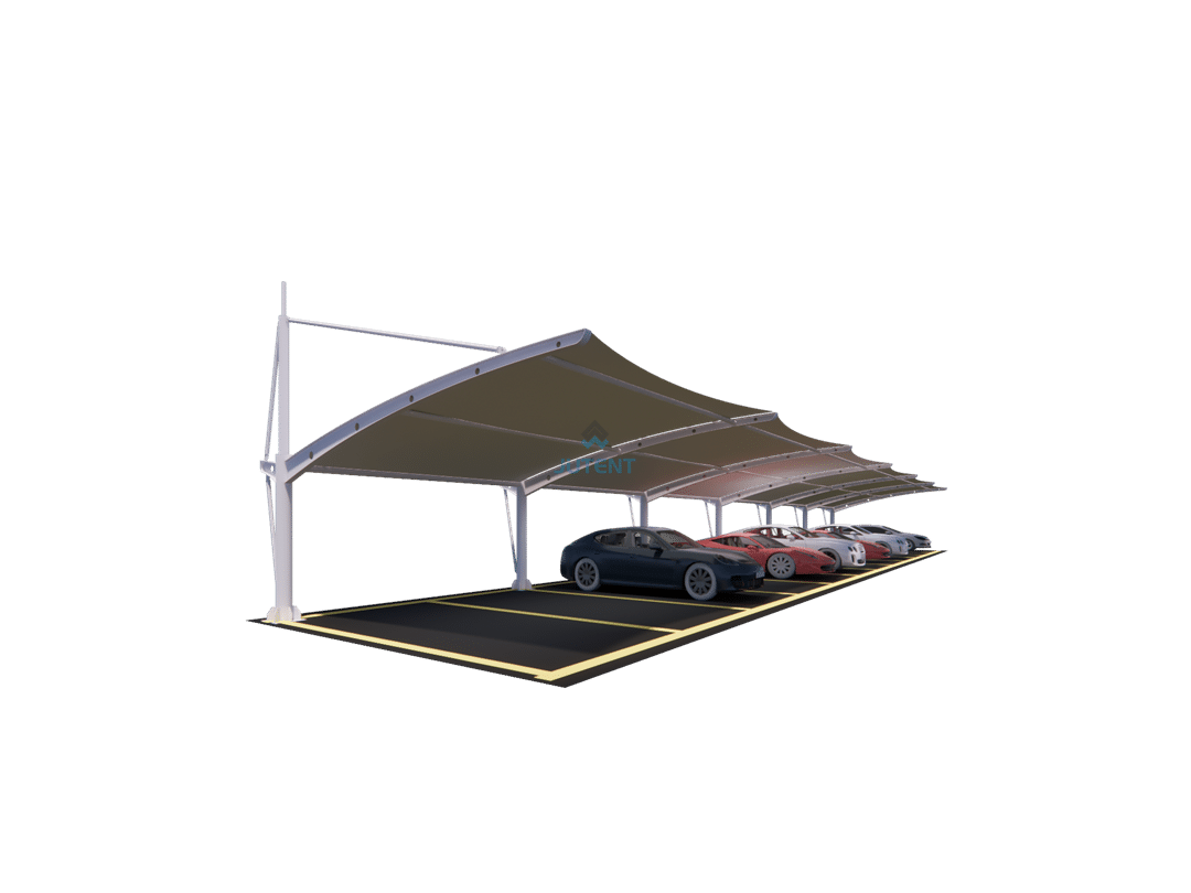 Rod-supported tensile membrane carport featuring a stable steel structure and clean design. Optimized load distribution makes it ideal for commercial, residential, and industrial parking areas.