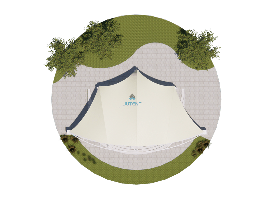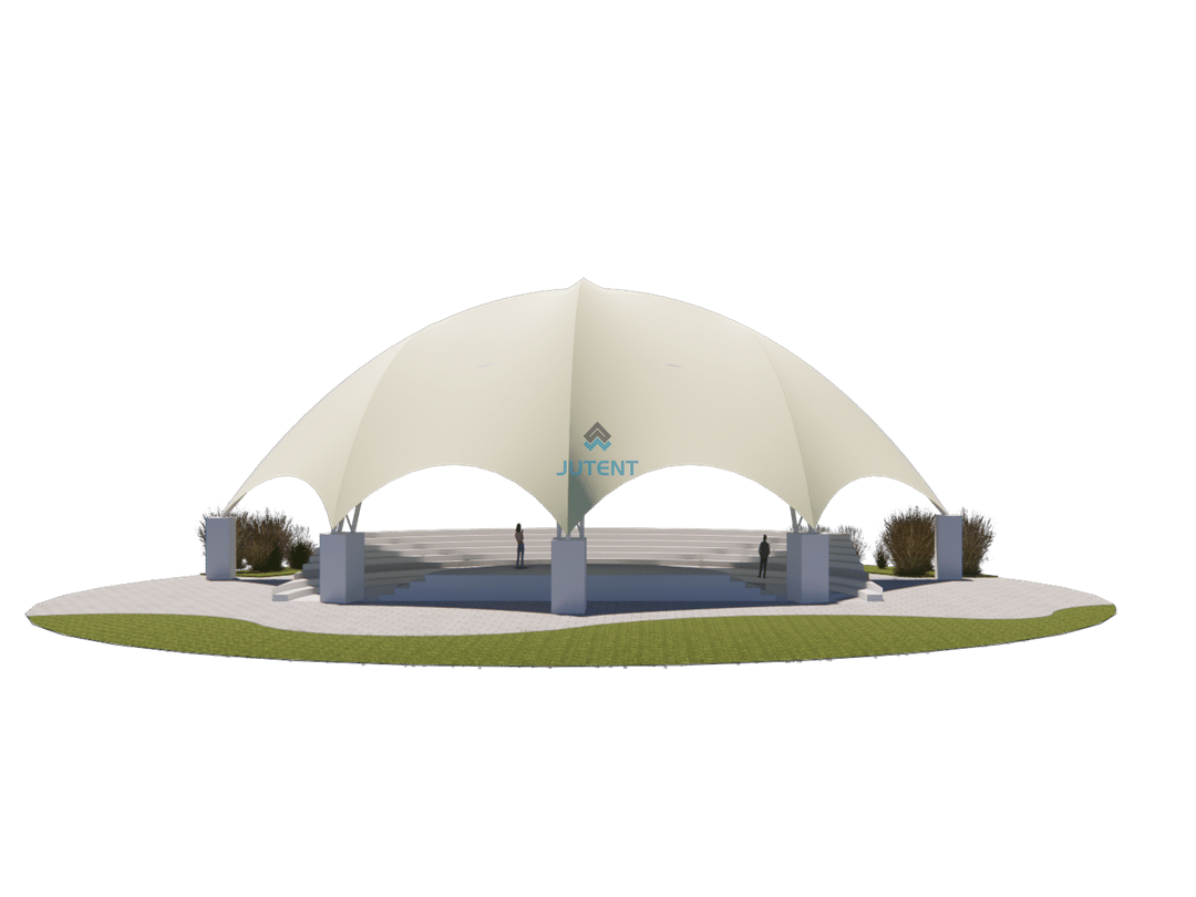 Shell-shaped tensile membrane stage roof featuring an elegant and functional design. Durable, weather-resistant, and fully customizable in size to meet various outdoor event and performance requirements.