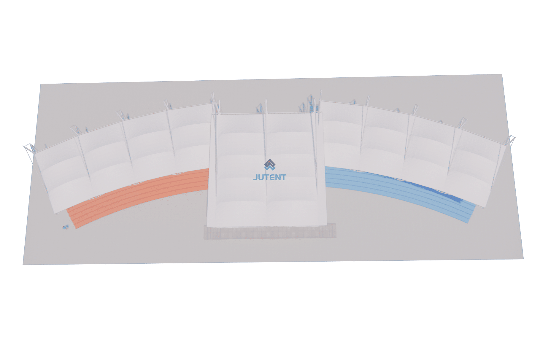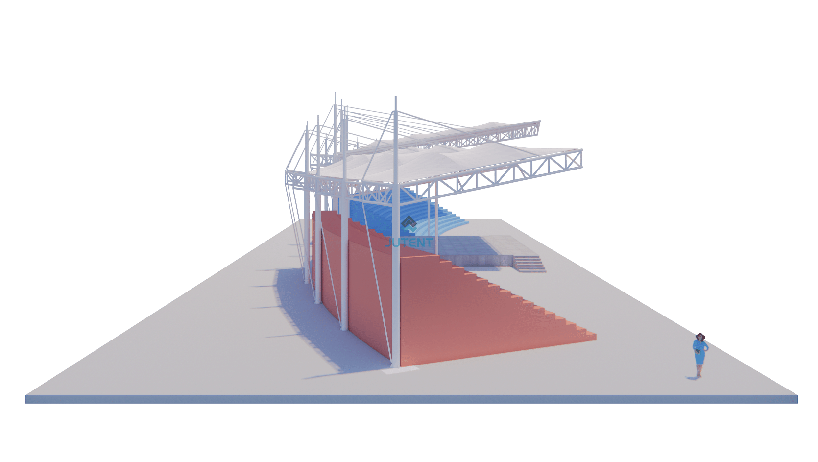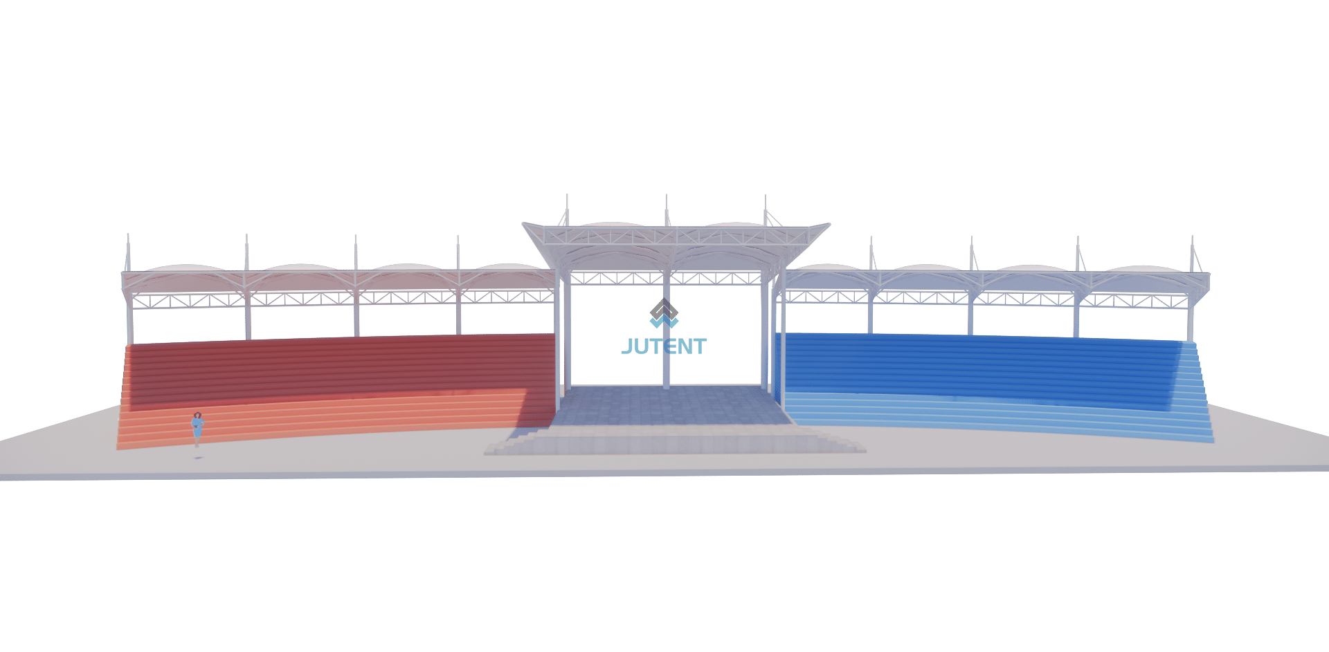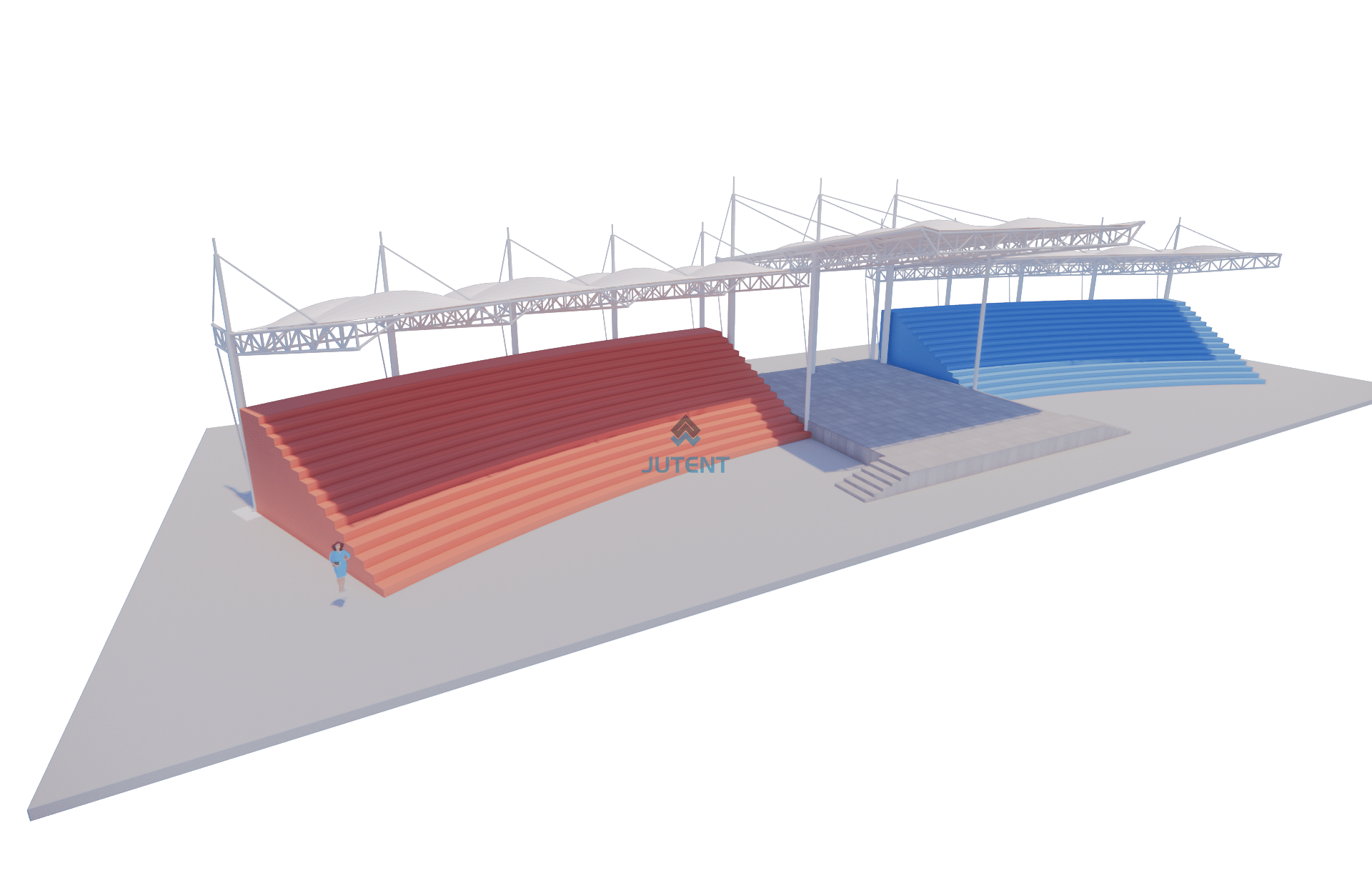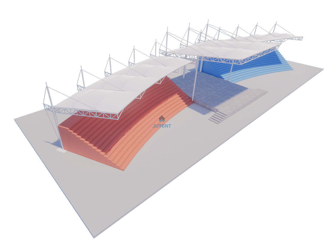 Tension rod supported tensile membrane canopy with a span starting from 10 meters. The length and height can be customized to meet project requirements, making it an ideal roofing solution for stadium grandstands and spectator seating areas.
