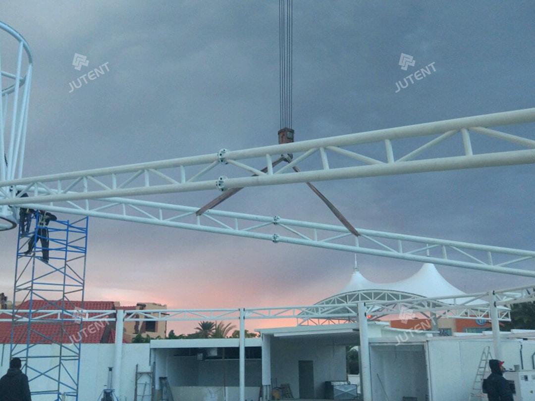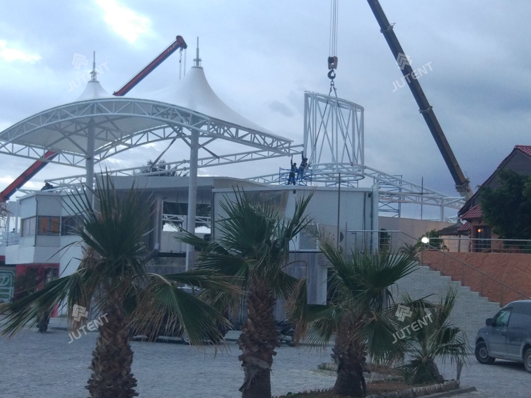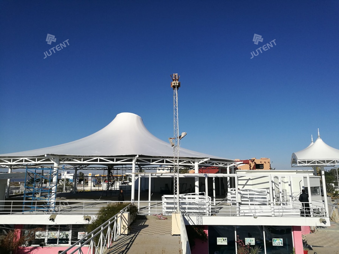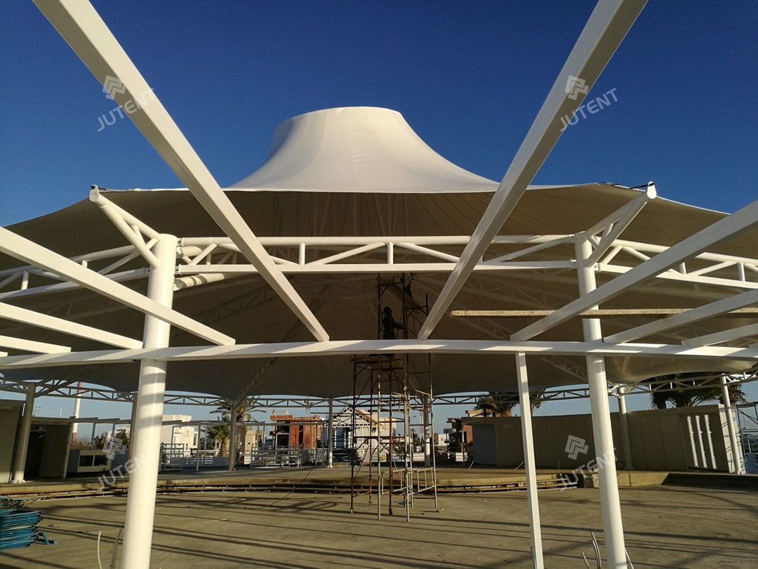 This project is located in the capital city of Tunisia and was completed in May 2020. It is a tensile membrane canopy project for an amusement park, consisting of an entrance membrane structure and a large circular tensile membrane roof. The main circular canopy has a diameter of 32 meters and a central height of approximately 12 meters. The total projected area is about 920 sqm, with a total steel consumption of approximately 32 tons.