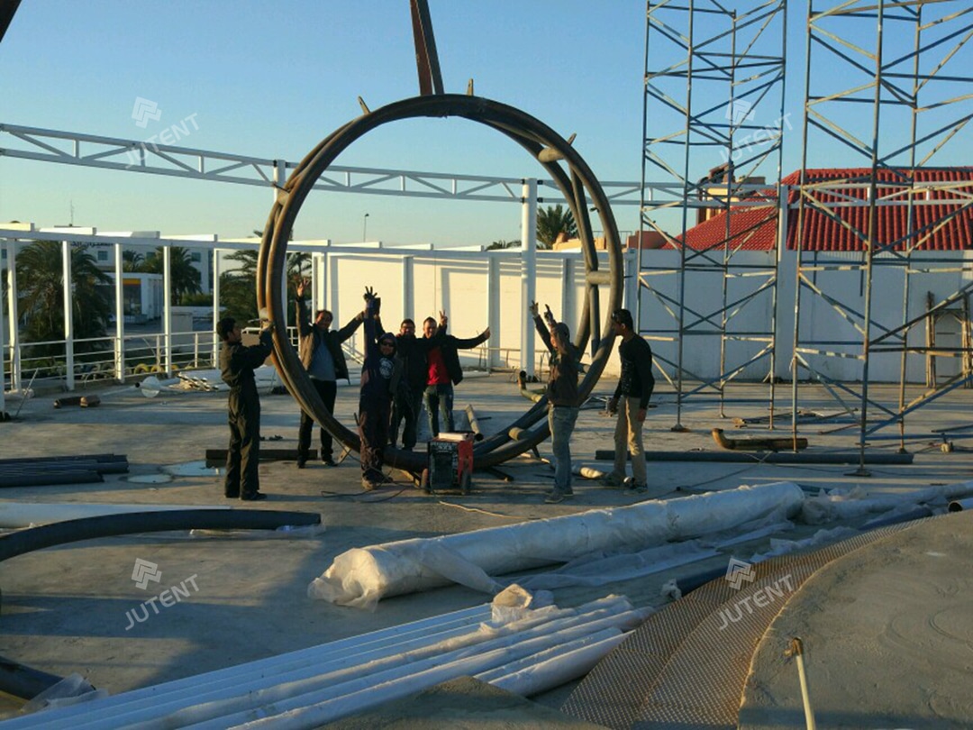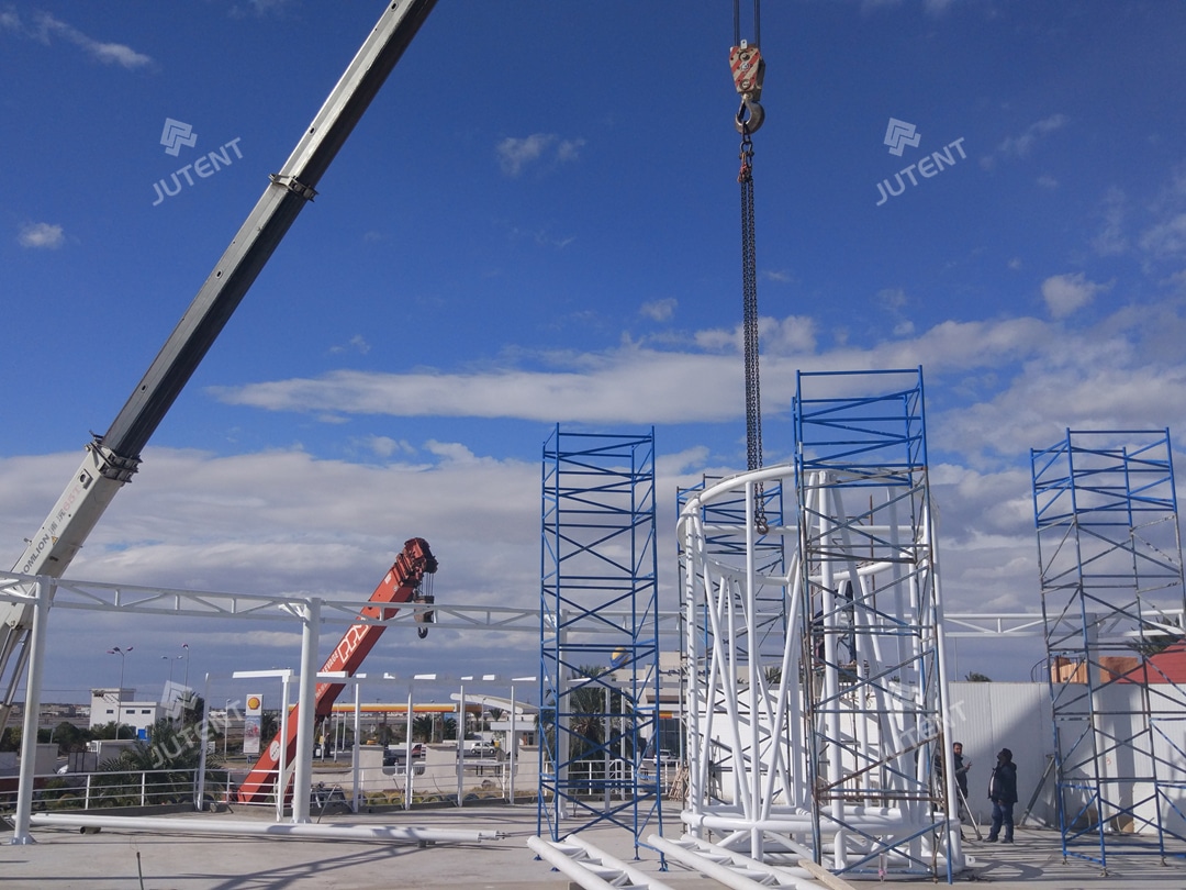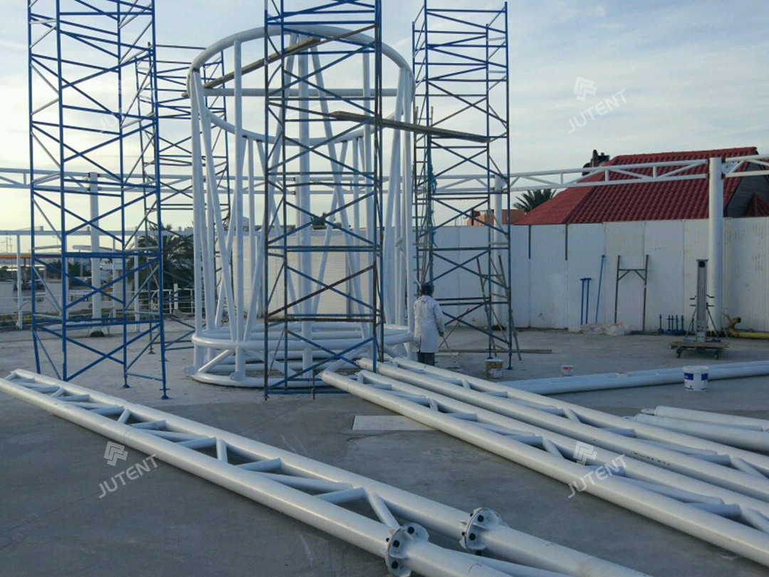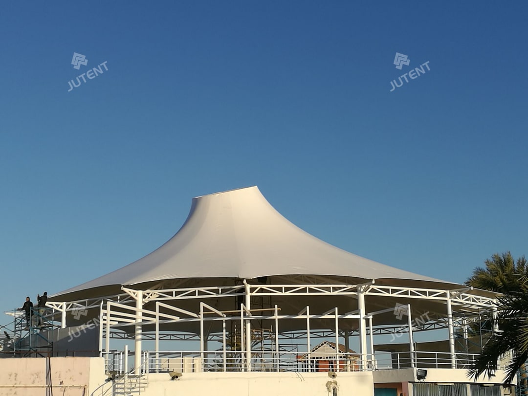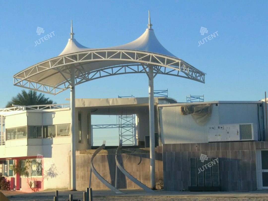 This project is located in the capital city of Tunisia and was completed in May 2020. It is a tensile membrane canopy project for an amusement park, consisting of an entrance membrane structure and a large circular tensile membrane roof. The main circular canopy has a diameter of 32 meters and a central height of approximately 12 meters. The total projected area is about 920 sqm, with a total steel consumption of approximately 32 tons.