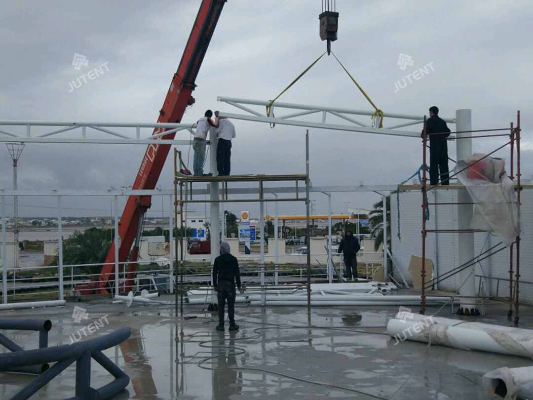 During construction, our engineering team provided on-site technical guidance throughout the installation process, including steel structure lifting and membrane installation. Due to an initial misjudgment of the load-bearing capacity of the existing concrete structure, minor foundation settlement occurred during lifting. Our engineers promptly proposed and implemented a foundation reinforcement solution, successfully resolving the issue and ensuring smooth project completion.
