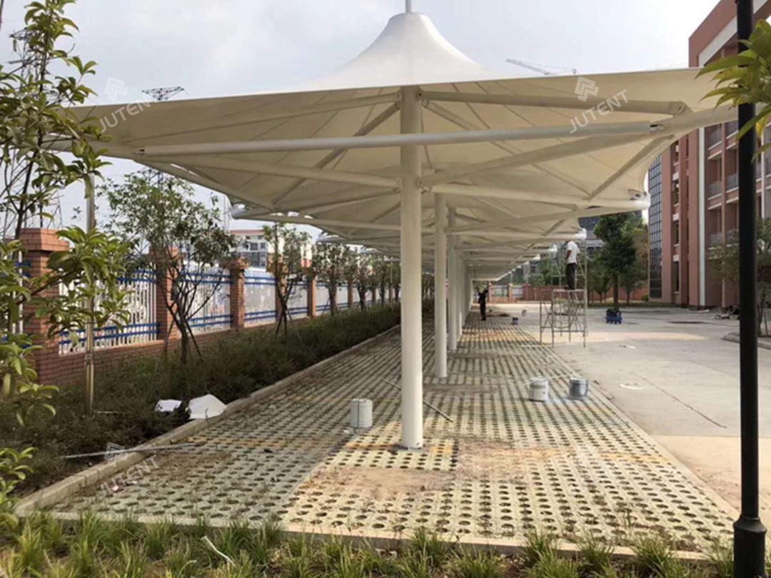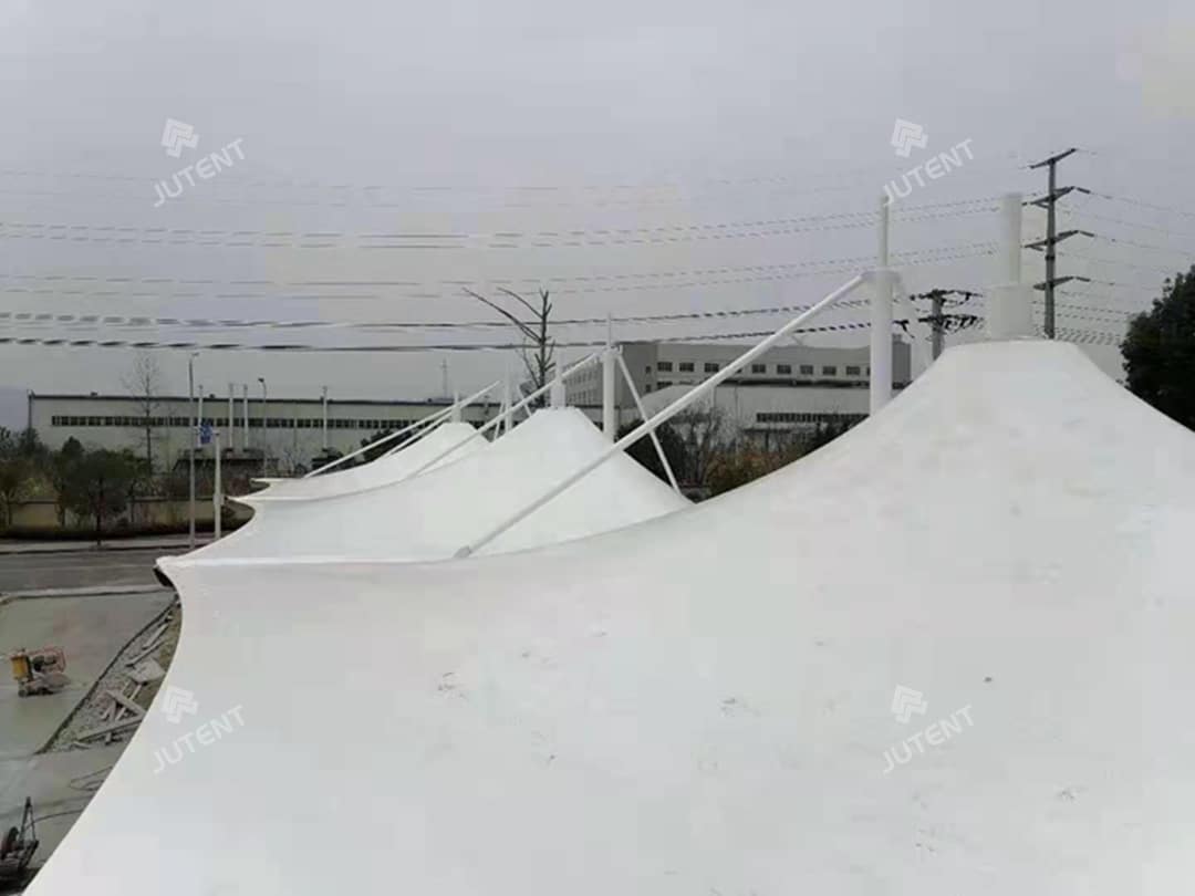 The client required a modern and aesthetically pleasing tensile membrane canopy to provide effective sun shading and rain protection for the internal parking area. Based on these requirements, a hat-shaped tensile membrane solution was proposed, featuring a clean appearance, stable structure, cost efficiency, and long-term durability.