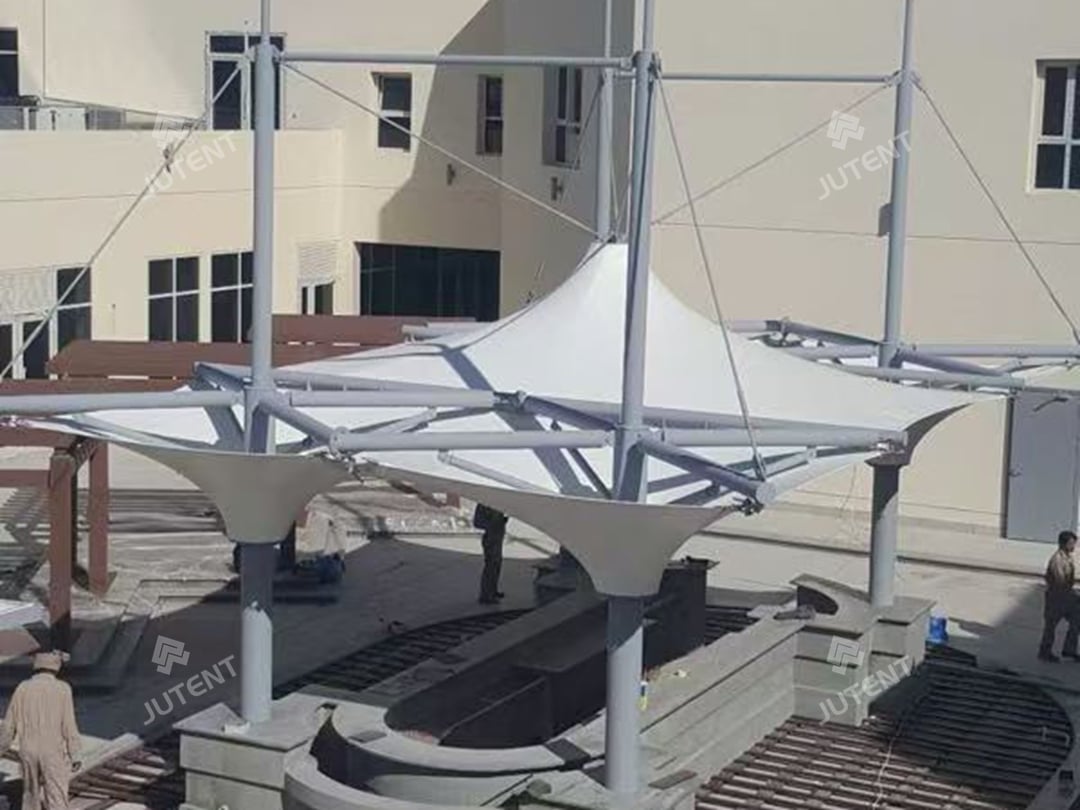 The structure is composed of high-performance PVDF membrane and steel supporting columns, offering excellent weather resistance, UV protection, and long-term durability. It is well-suited for various outdoor environments, ensuring safety and structural reliability over time.
