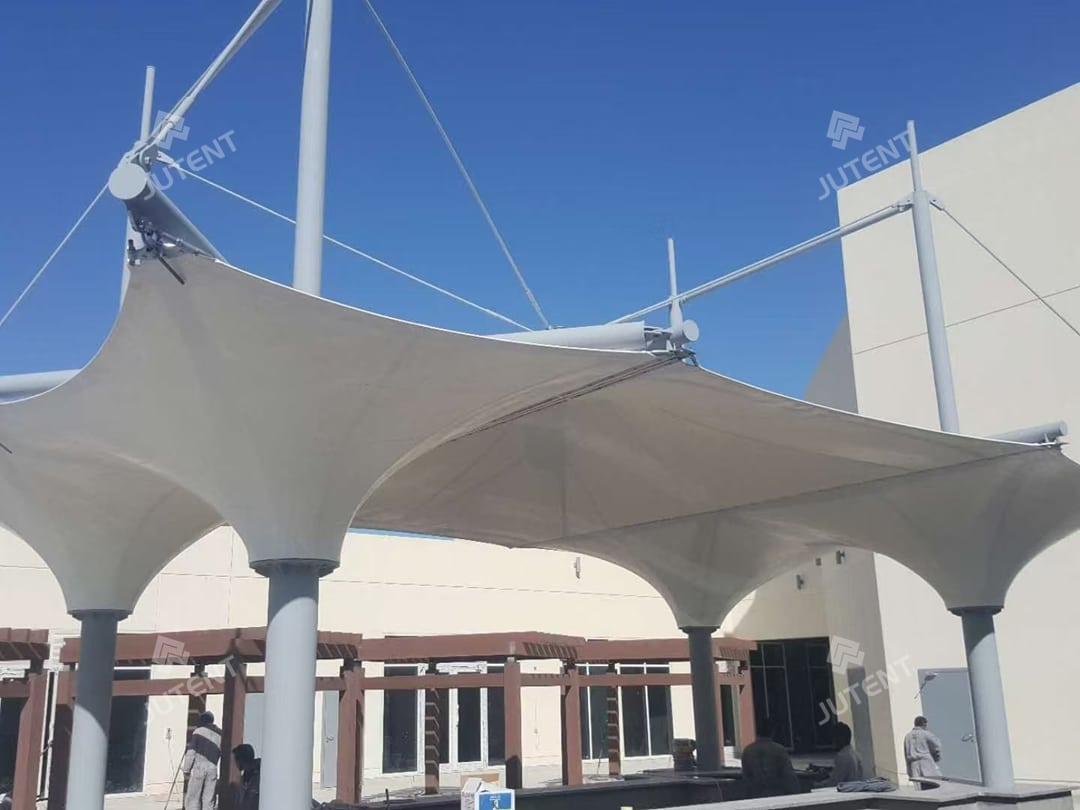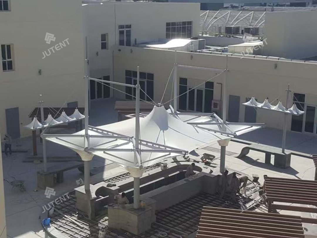 Featuring a striking inverted cone design, this 168㎡ PVDF installation serves as a prominent commercial landmark in Egypt. The Plaza Shade Structure delivers high-tension structural stability and essential UV protection for leisure spaces.
