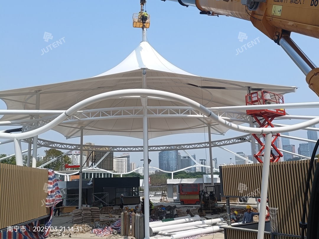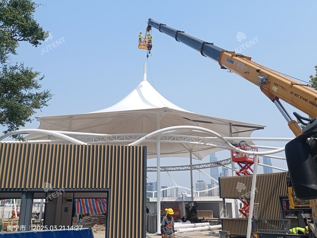 The project is located at Folk Song Lake, Nanning, China, and involves a large-scale commercial tensile membrane canopy structure. Completed in June 2025, the project was delivered within a total construction period of approximately 20 days. The canopy covers a total area of about 1,120 m², featuring a 28-meter-diameter circular dome as the core structure, with a maximum height of approximately 18 meters.