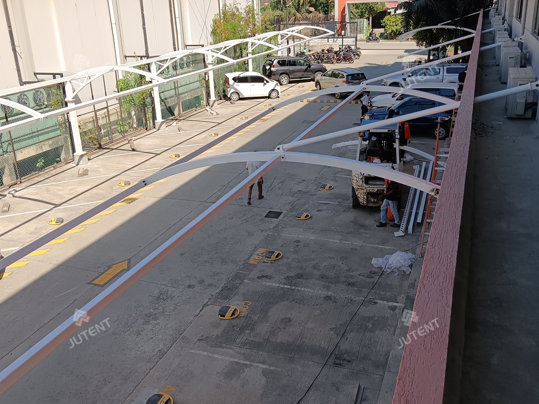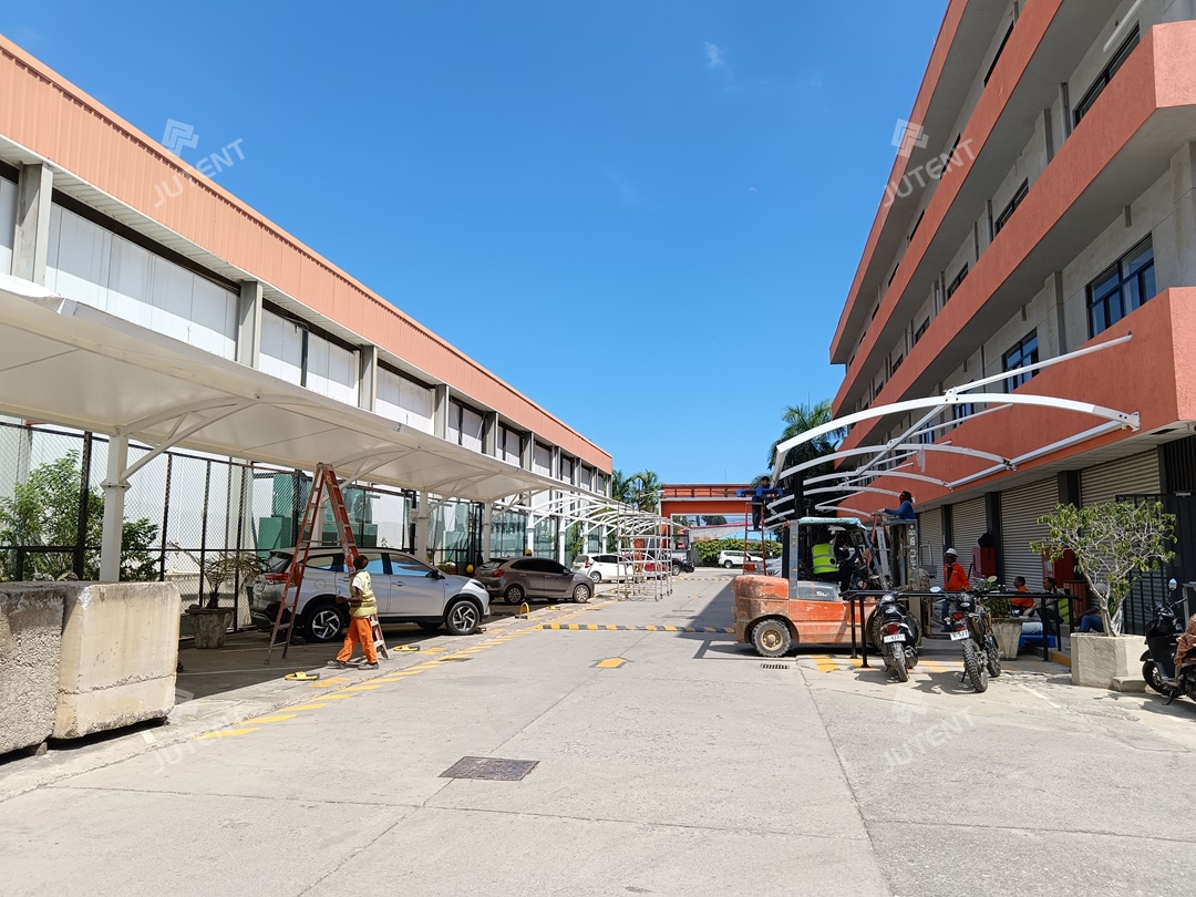 Timor-Leste is located in the tropical region of the Southern Hemisphere, characterized by high temperatures and heavy rainfall throughout the year, with distinct wet and dry seasons influenced by equatorial climate systems. The client required a shading and rain-protection solution for the parking area, with a simple appearance and practical structure. Due to site constraints, three parking rows could not accommodate ground-mounted columns, requiring the carport to be anchored to the main office building structure. During the design phase, our engineering team conducted professional structural analysis based on site conditions and the architectural drawings of the office building. A semi-arched tensile membrane carport solution with a 6-meter width and diagonal bracing was developed. This design ensures structural safety while achieving an optimal balance between functionality, cost efficiency, and aesthetics. The solution was highly approved by the client.
