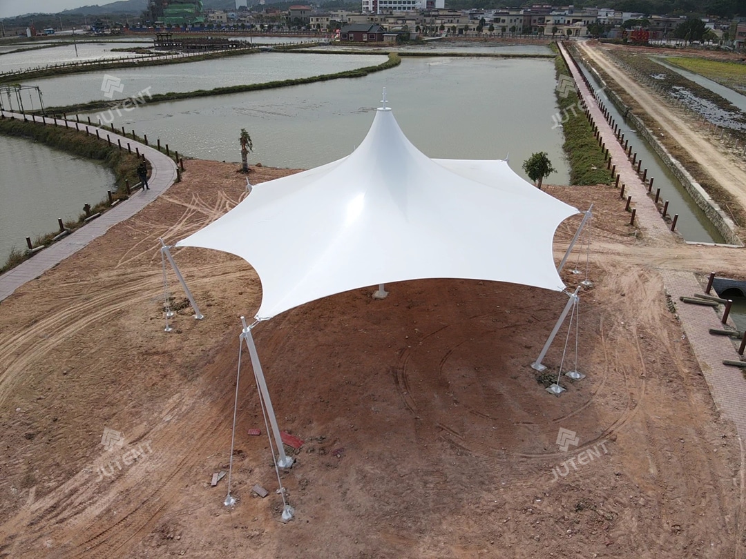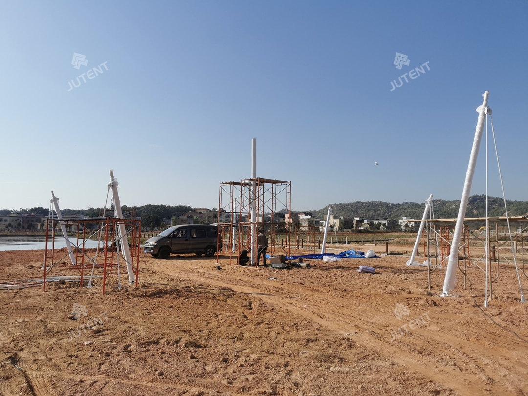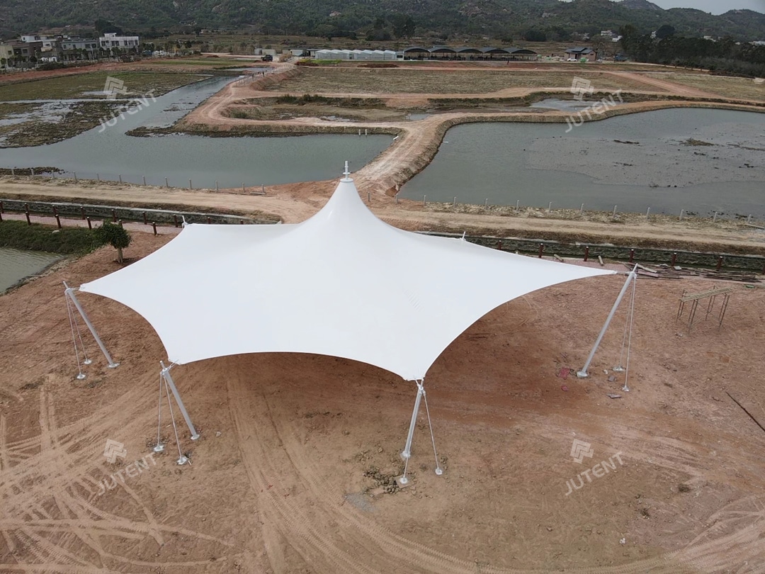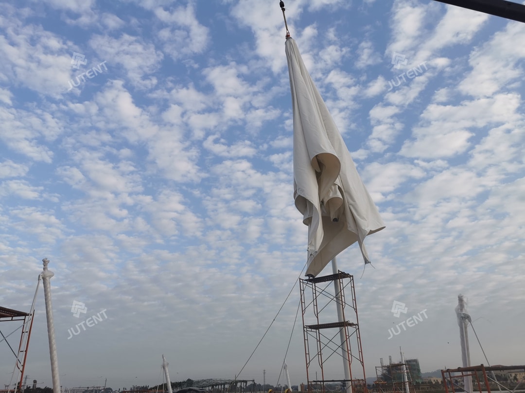 The structure adopts a flexible edge cable-supported system, with overall dimensions of approximately 20 m × 15 m, a height of about 4 m, and a total projected area of around 300 sqm. The total steel consumption is approximately 2 tons.