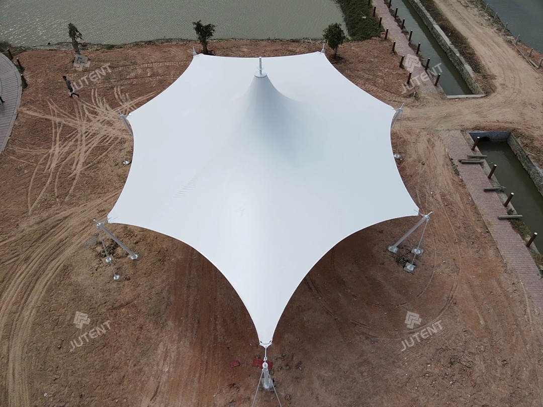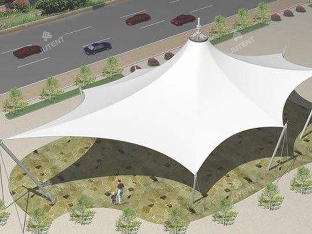 The flexible-edge tensile membrane solution applied in this project is ideal for landscape features, park structures, and various commercial or industrial public spaces.