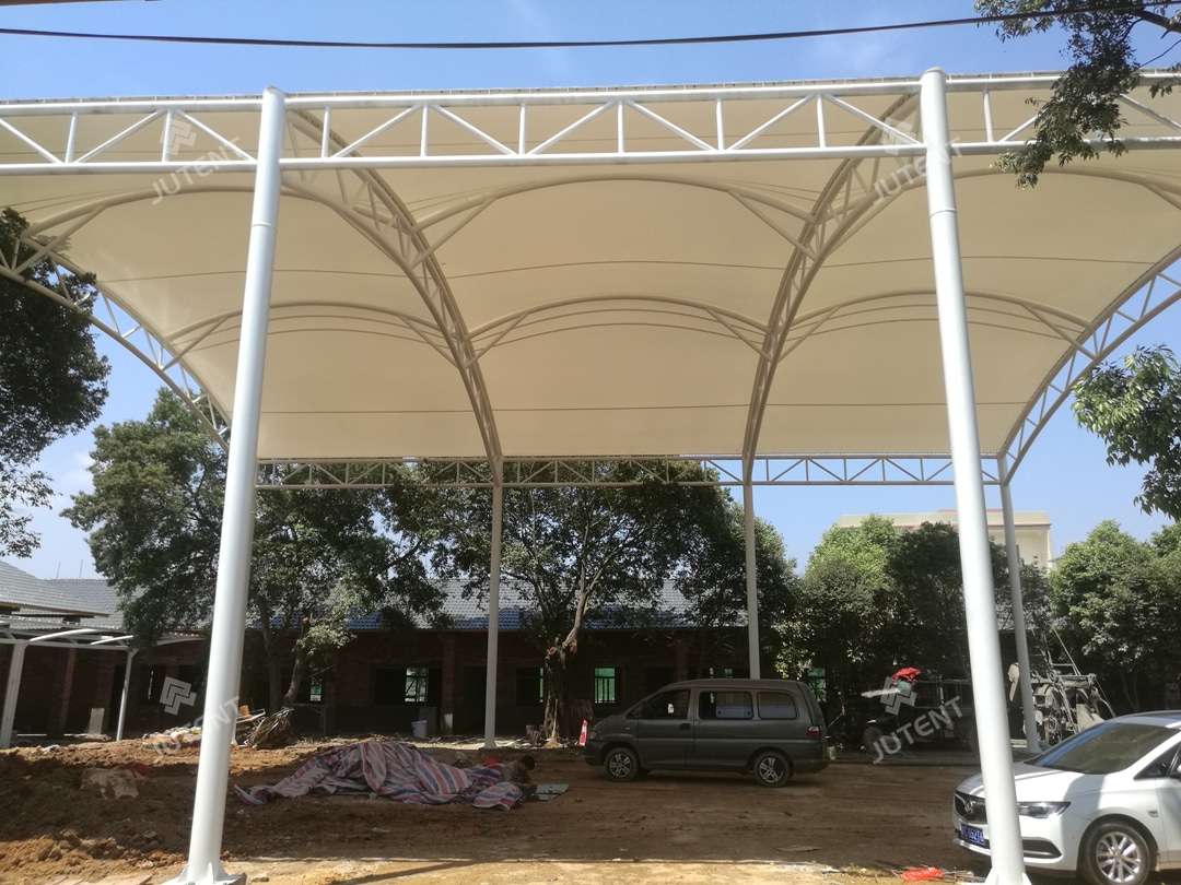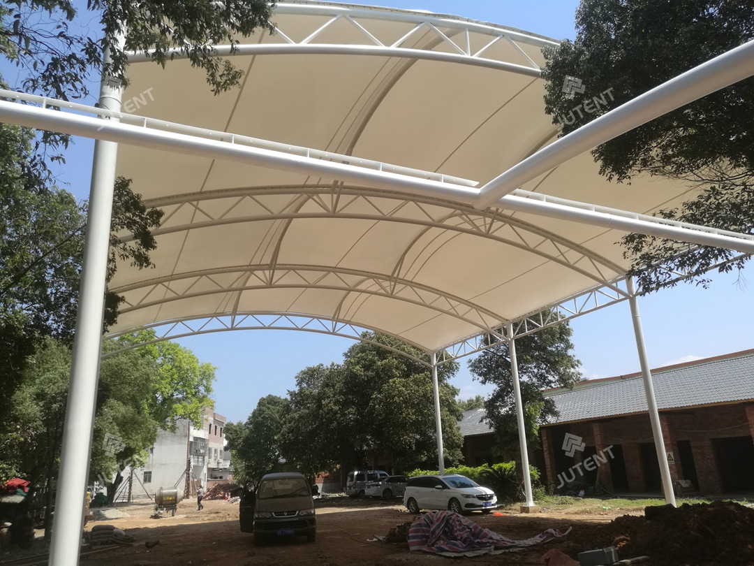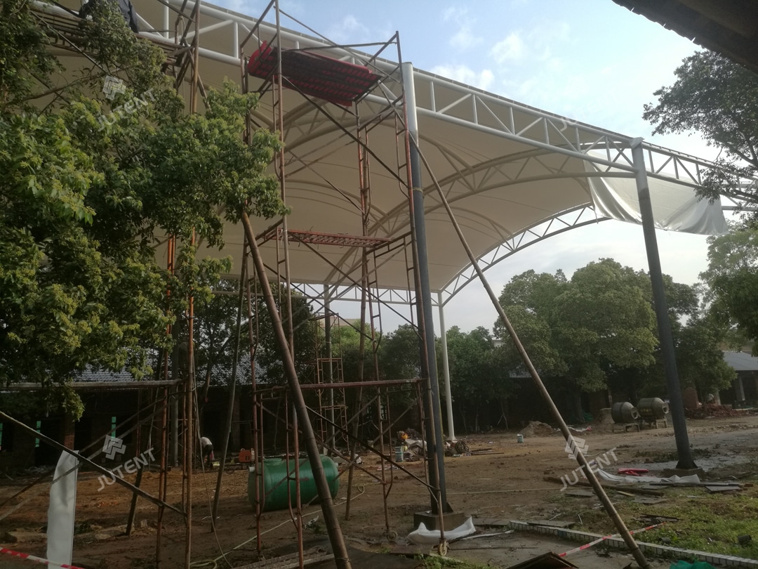 This project is in Yingde District, Qingyuan, Guangdong, China, and was finished in December 2023. The basketball court is 15 m × 28 m, and it is covered by a tensile fabric roof measuring 17 m × 30 m. Around 653 m² of membrane was used. The roof is made of white PVDF architectural fabric (1100 g/m²) and meets B1 fire safety standards.