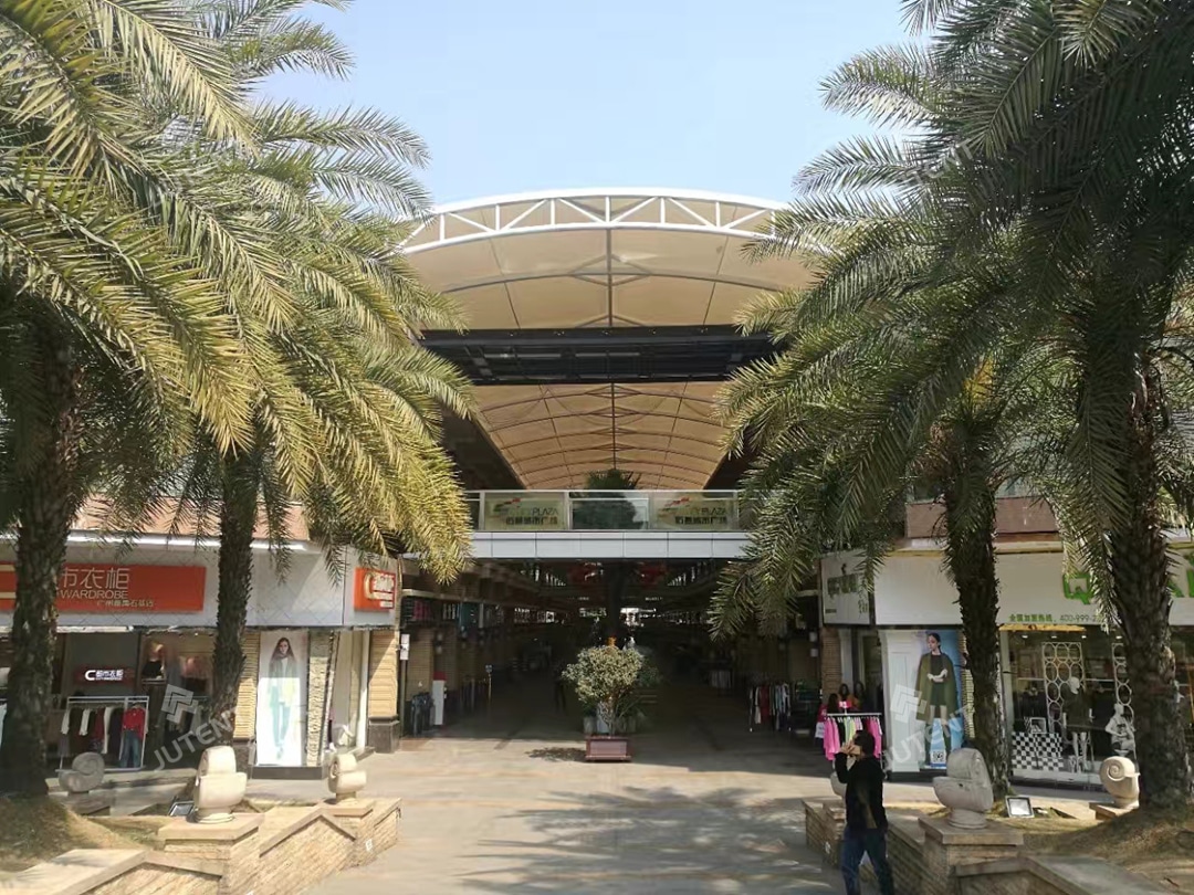 This project is located at Shiji Urban Square, Guangzhou, China. Completed in 2018, it is a commercial tensile membrane canopy covering pedestrian walkways and retail areas. The total construction area is approximately 2,600 ㎡, featuring a combination of modern curved and hat-shaped tensile membrane roofs supported by a steel structure.