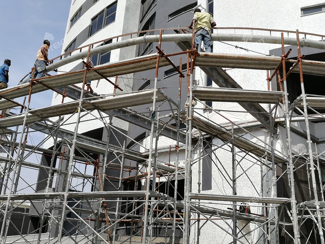 This tensile membrane entrance canopy project is located in Nigeria and was completed in 2019. The structure covers approximately 469 m² and features a cantilevered hat-shaped roof supported by a steel framework. All steel components are protected with an epoxy zinc-rich primer and white topcoat for enhanced corrosion resistance. The roof is clad with 1100 g/m² white PVDF architectural membrane with B1 fire rating, complying with safety standards for semi-permanent buildings and public spaces.