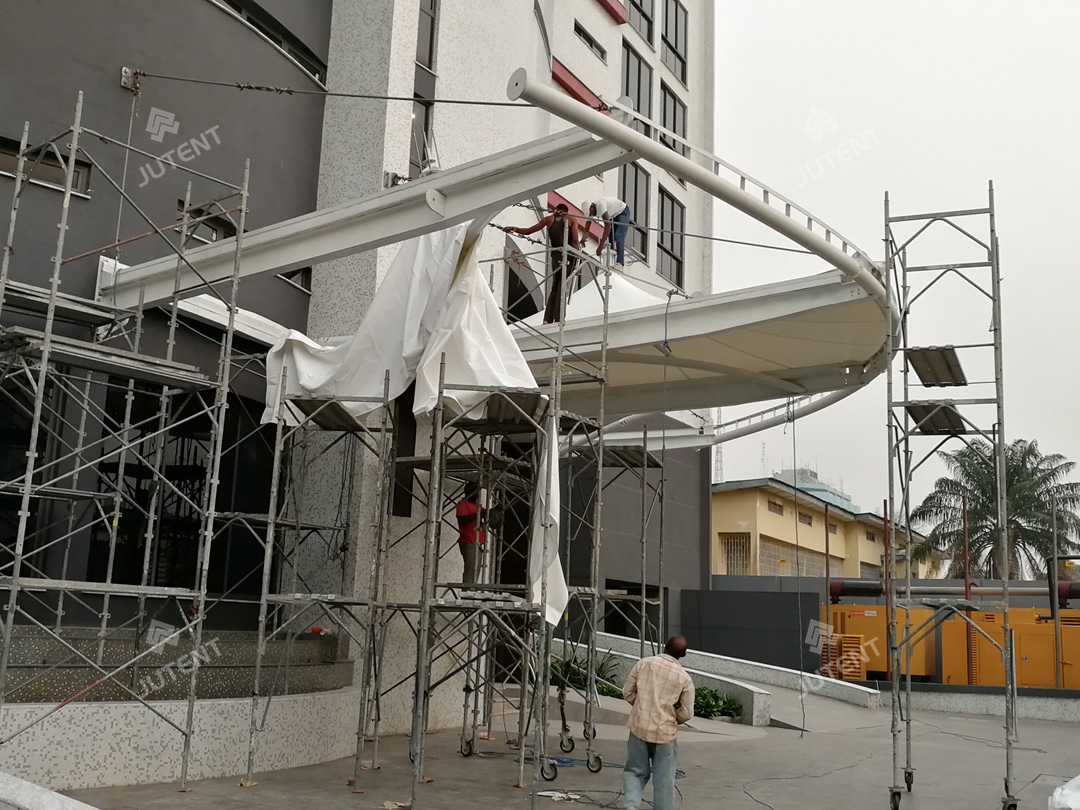 Office entrance tensile membrane canopy in Nigeria (2019). 469 m² PVDF hat-shaped roof on steel frame provides durable sun and rain protection.