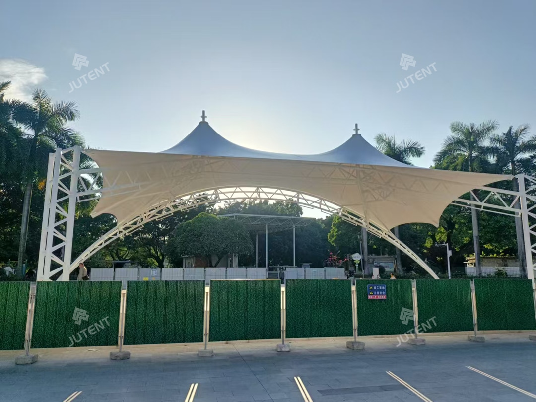 People’s Park stage tensile membrane roof in Dongguan, China, completed 2024. Double-peak PVDF membrane with steel structure provides durable sunshade, rain protection, and enhanced stage aesthetics.