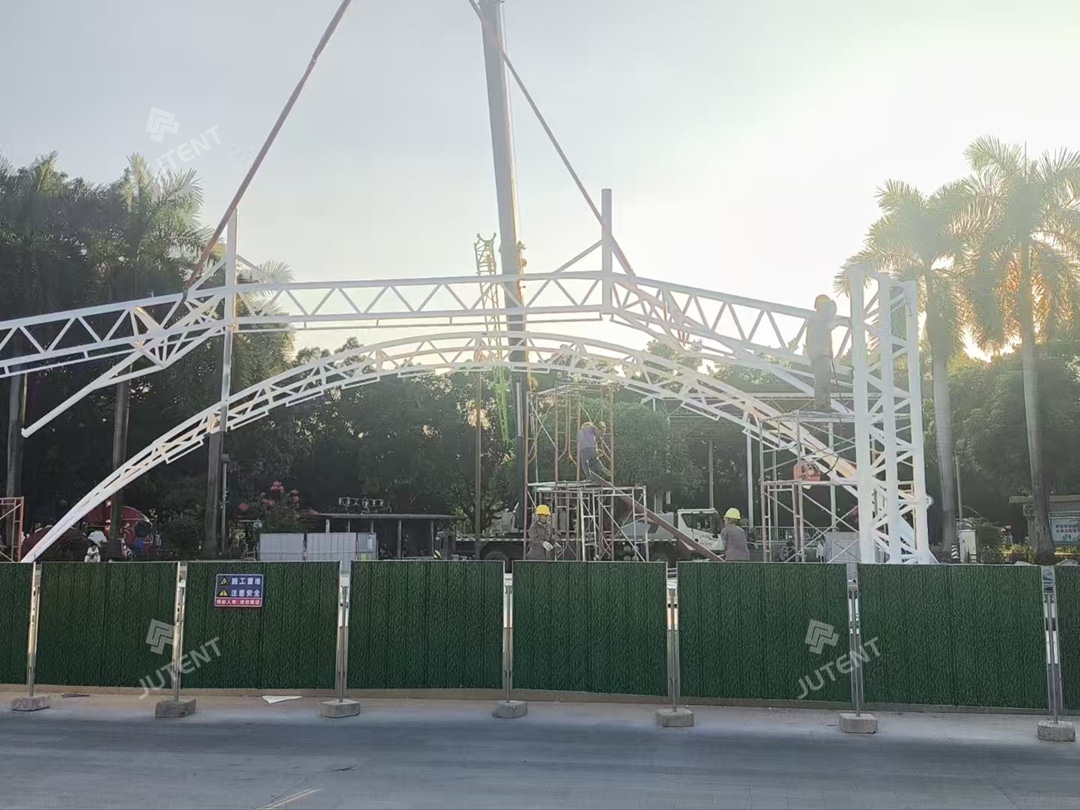 This project is located in People’s Park, Dongguan City, China, and was completed in December 2024. It is a public stage tensile membrane roof project. The canopy measures approximately 24 m × 10 m, with a central height of about 4 m, and a total steel consumption of around 4 tons. The overall construction period was approximately 25 days.