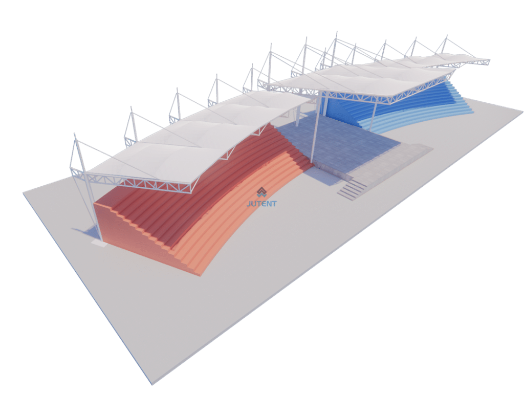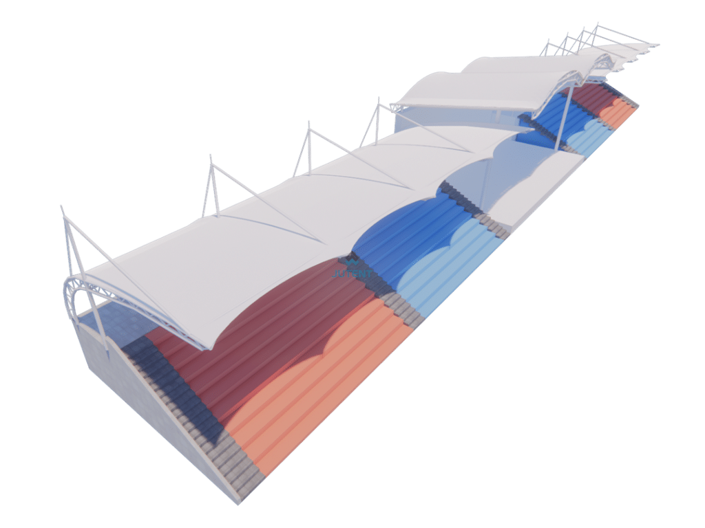 Rod-supported tensile membrane grandstand canopy for stadiums, providing durable weather protection, structural stability, and a modern design with customizable dimensions. Ideal for sports venues and spectator areas.