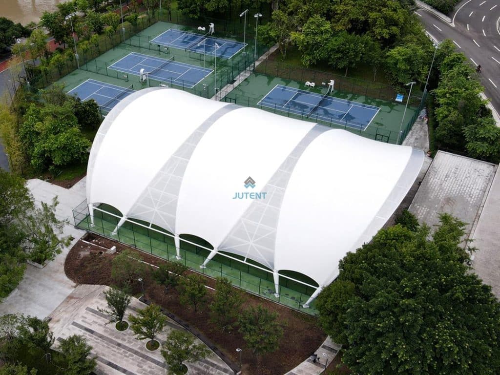 Jutent large-span tensile membrane roofing systems for stadium grandstand seating, delivering durable shading solutions and long-term environmental protection for modern sports venues.