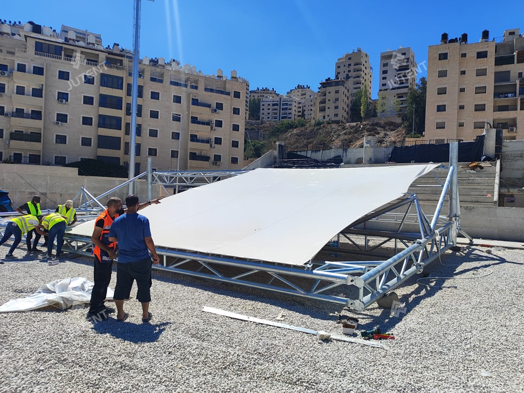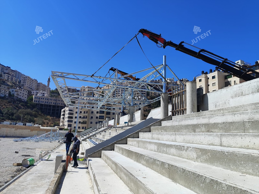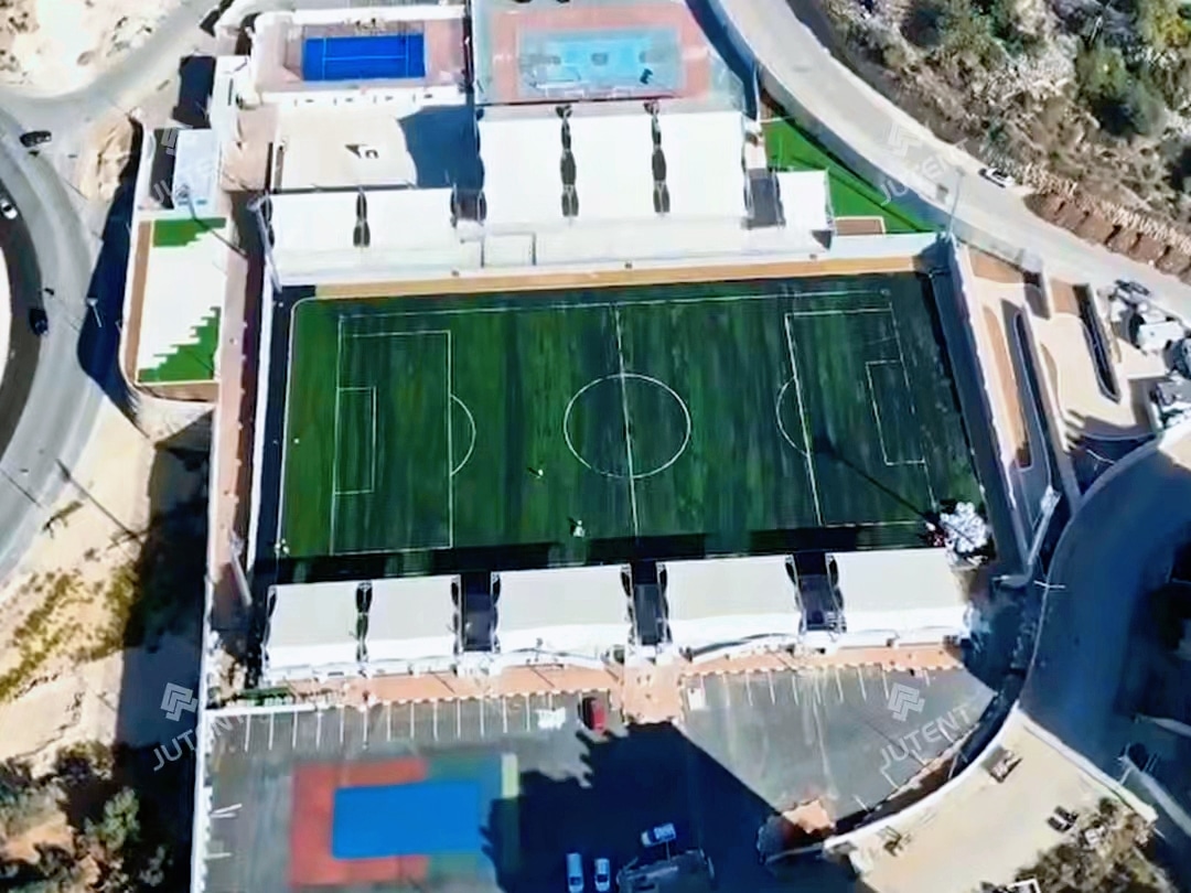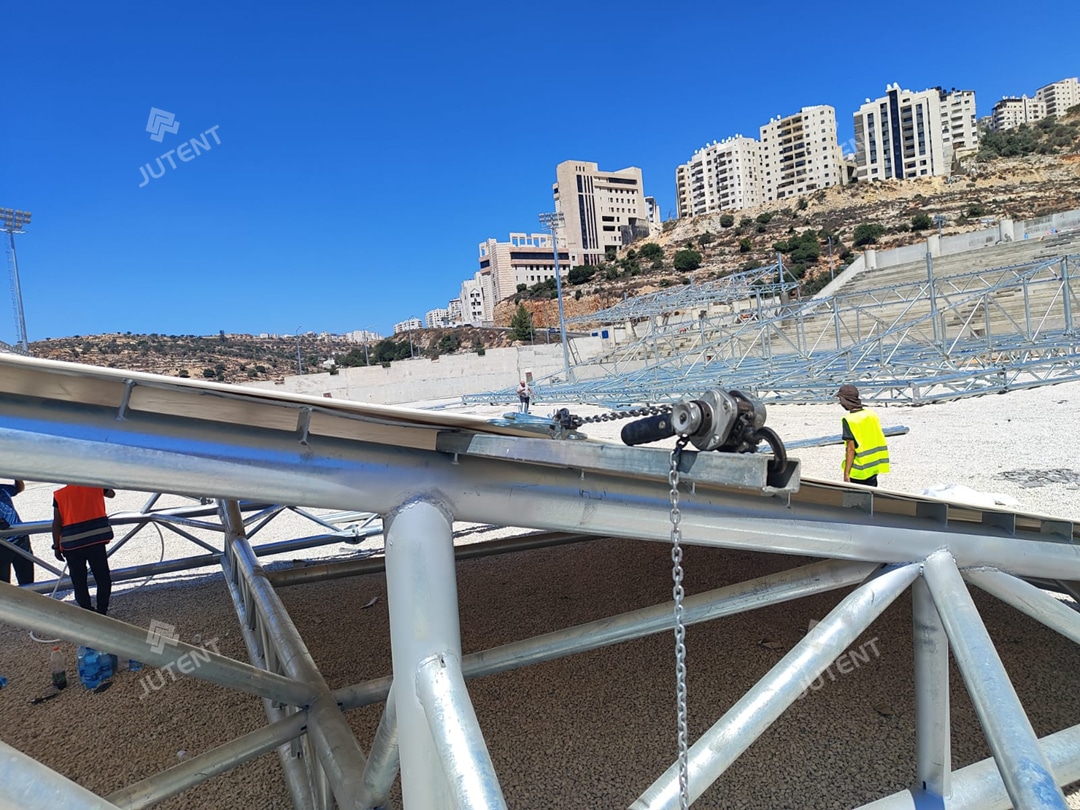 This project is located in Palestine and was completed in July 2025. It is a tensile membrane grandstand roofing project for a football stadium. The grandstands are arranged on the east and west sides of the stadium.